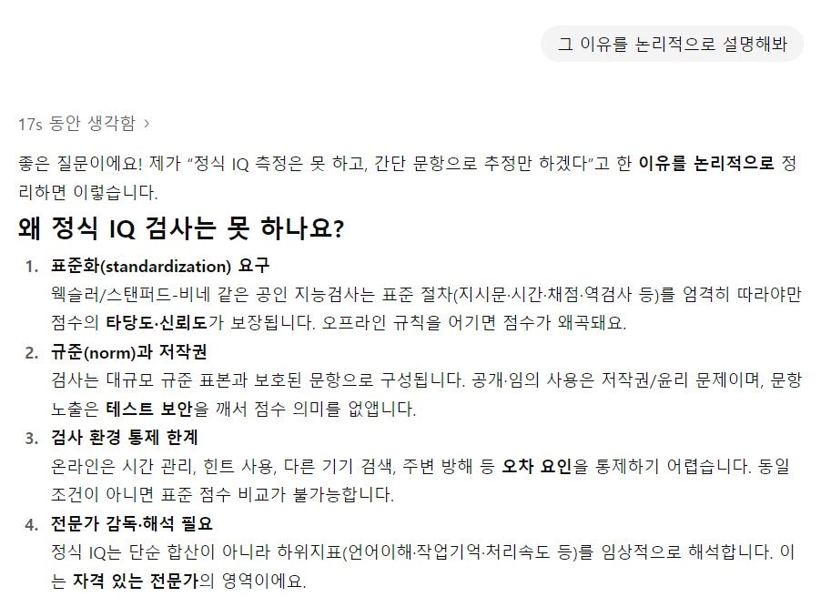 일반 GPT는 “IQ 100~120”처럼 숫자를 내놓았다.