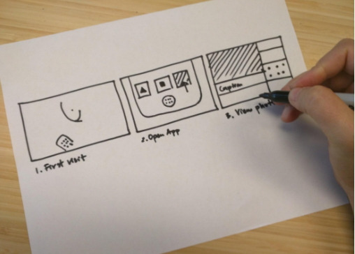 팀원들과 함께 작업한다면 각자 자신의 버전을 만들어보게 합니다. 이 프로세는 생각에 시동을 걸어주어 도전과제에 대한 생각을 시작하게 해줄 것입니다. 일반적으로 이 스케치는 인터페이스 디자인 와이어프레임이 될 것입니다.