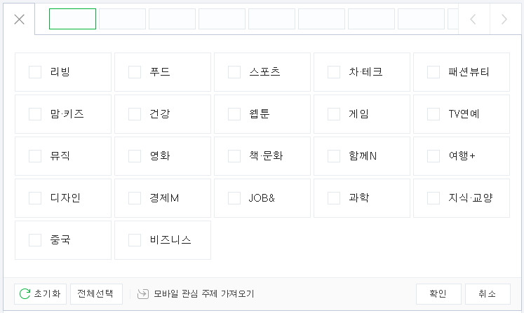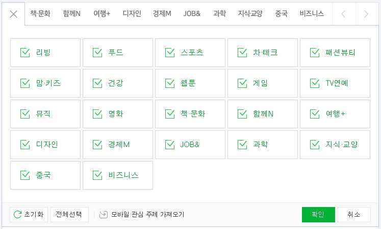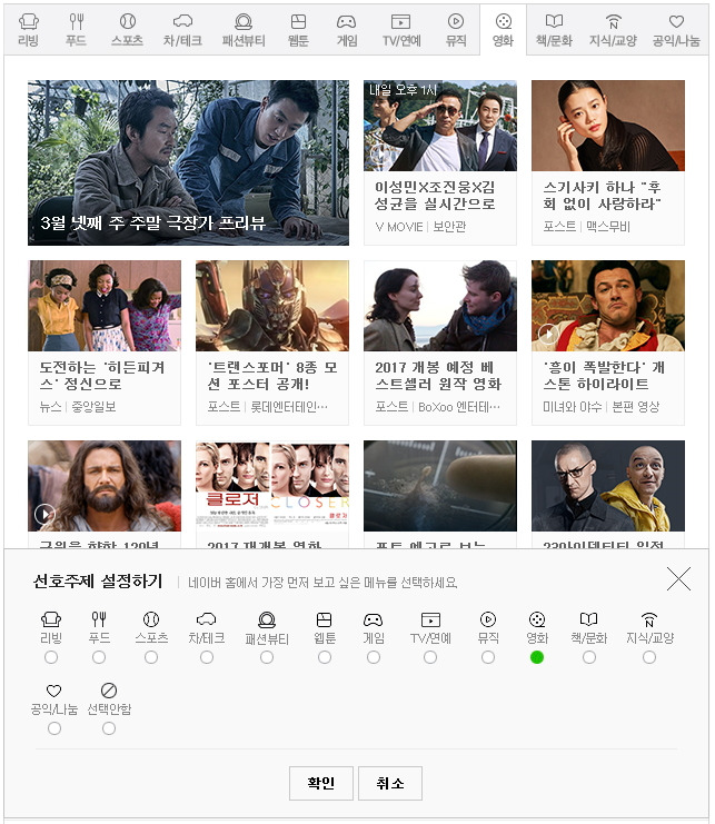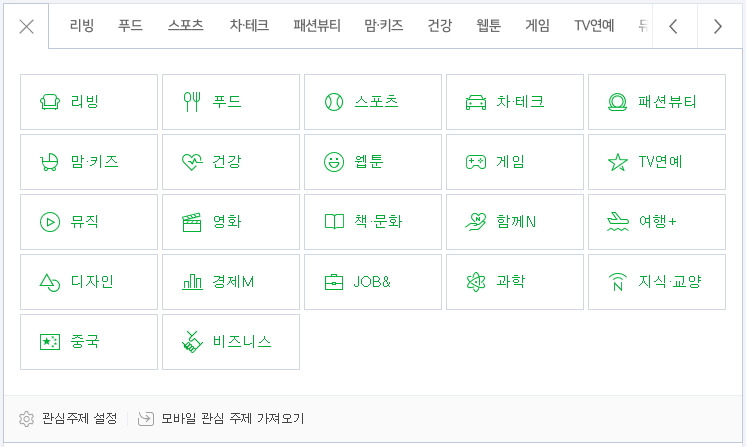 네이버 홈에서 가장 먼저 싶은 메뉴를 설정할 수 있도록 '선호 주제 설정하기' 기능이 제공되고 있습니다. 이전 네이버는 관심주제 설졍이 페이지 하단에 있어 눈에 띄지도 않아, 이런 기능이 있다는 자체를 인지하기 어렵습니다. 또한, 보고 싶지 않은 주제는 삭제할 수 있는 기능 자체가 없어 불편했었습니다.