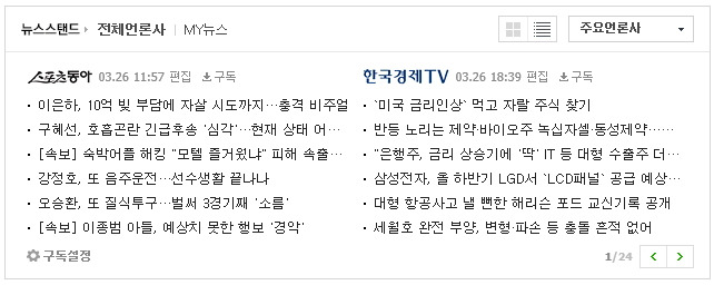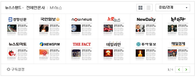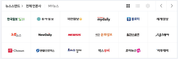 뉴스 스탠드는 종합편성채널, 지역신문 등 더 다양한 언론사의 뉴스 기사를 선택하여 보실 수 있고,