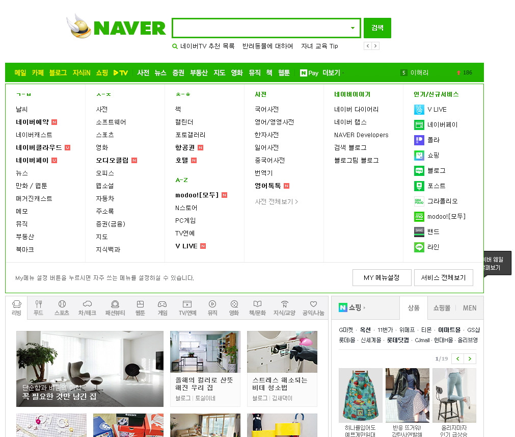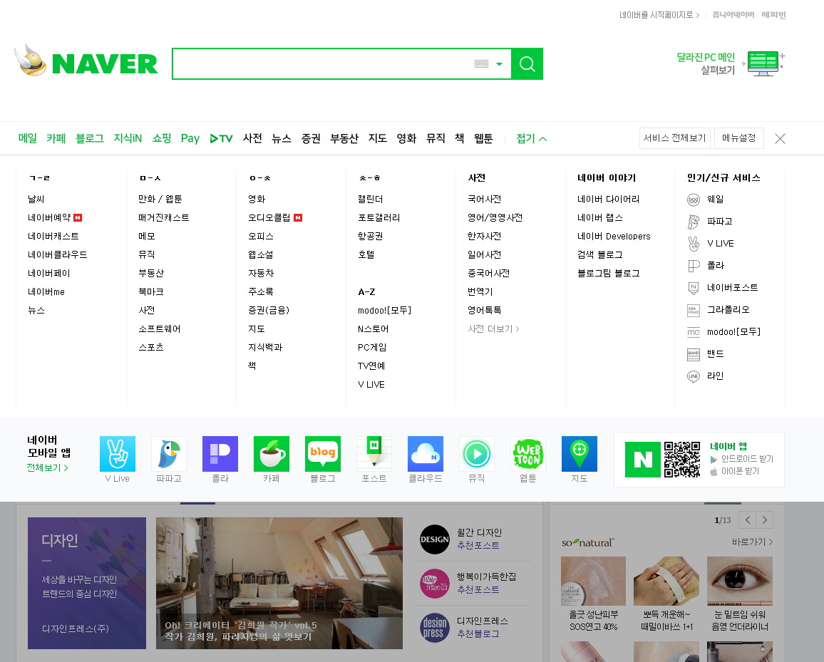 반면 개편된 네이버에는 웹의 전체 서비스 외 모바일 앱까지 한 번에 조회할 수 있도록 편의를 높이고 있습니다.