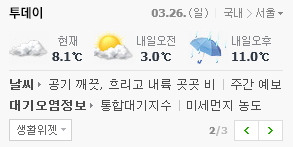 네이버는 투데이라는 코너를 운영하고 있습니다. 시간대별 현재의 이슈를 알 수 있고, 지역 기반의 날씨 정보, 주가 정보, 스포츠 기사 등을 섹션 별로 조회할 수 있습니다.