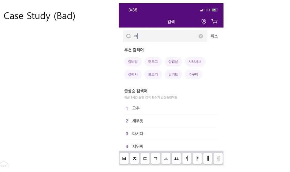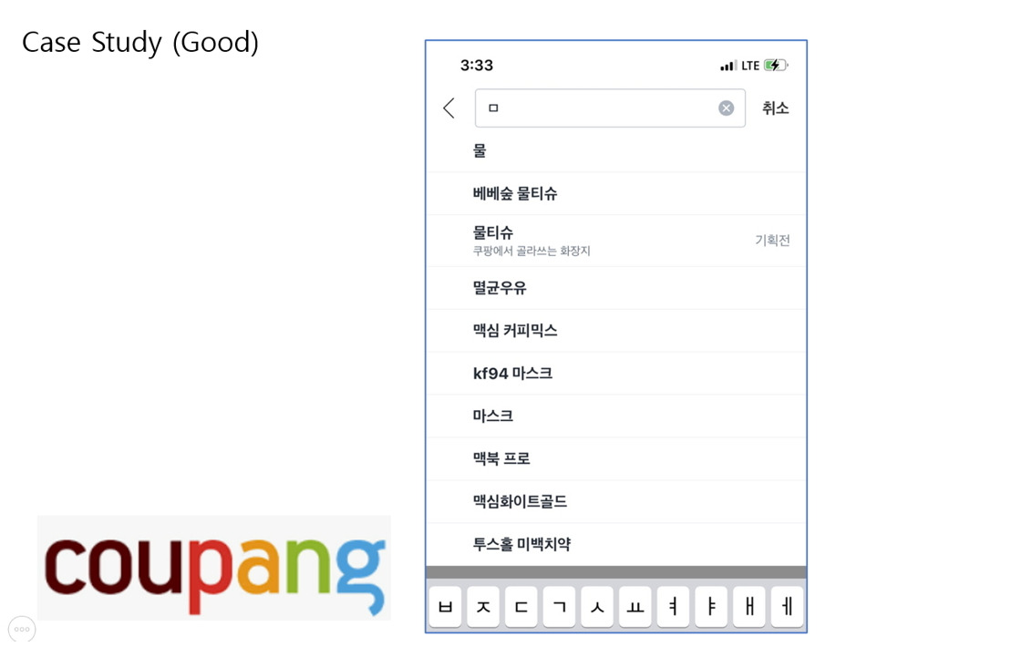 따라서, 통합검색창에서 사용자가 키워드 검색 입력하는 과정이나 번거로움을 해소하기 위해서, 초성 검색이 제공된다면, 사용자가 상품명을 다 입력하지 않아도 그만큼 입력의 편의성이 높아질 것입니다.