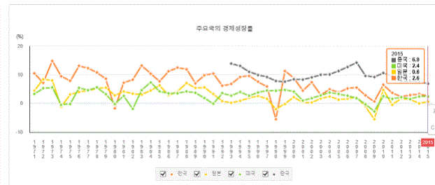 국가의 성장을 판단하는 주요 경제지표인 경제성장률{(금년도 실질GDP-전년도 실질GDP)/전년도 실질GDPx100}을 기준으로 2015년은 2.6% 성장했고, 1973년 14.8%로 최고 성장을 기록한 이후, 몇 차례의 국제경제 위기(1979년 국제유가폭락, 1997년 IMF 구제금융, 2008년 금융위기)를 제외하고는 2000년 초반까지 줄곧 고성장을 이루어왔다. 그야말로 식을 줄 모르는 열기 속의 한강의 기적을 이루었다. 그러나 지금은 서서히 그 열기가 찬바람을 맞기 시작했다. 올 2016년도 경제성장률 역시 3%를 넘어서기는 현실적으로 불가능하며, 지난 5년간 평균 3%를 넘어서지 못했다.(11년 3.7%, 12년 2.3%, 13년 2.9%, 14년 3.3%, 15년 2.6%, 16년 2% 중반예상)