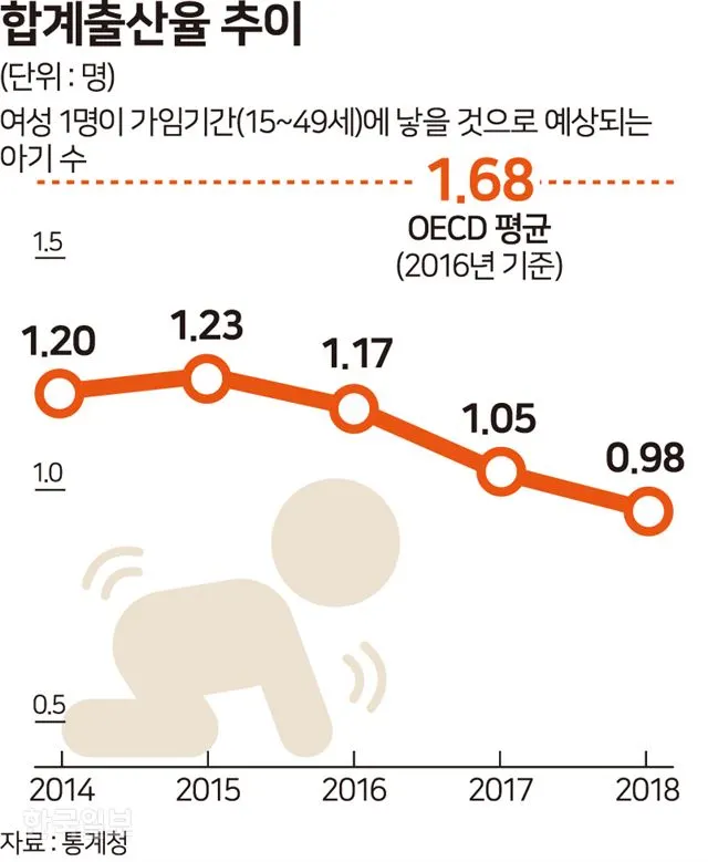 그 뿐인가? 엎친데 덮친 격으로 가임여성의 합계출산 0.98명으로 저출산고령사회의 심각한 수준을 넘어선 성장동력이 떨어진 한국의 우울한 현재의 모습이다.