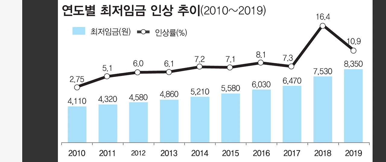 하루 8시간 일한다고 가정하면 일급이 66800원인데 이렇게 간단히 시급을 주는 게 아니다. 사업주은 시급에 더해 주휴수당도 주어야 하고(1일치에 해당하는 급여) 4대보험도 부담해야하고 각종 부대비용도 지급해야 한다. 결과적으로 최저임금의 실질 인상은 명목 인상률 27%보다 더 높다. 이렇게 급격하게 오른 최저임금으로 경제가 우리가 애초에 기대했던 결과가 자연스럽게 되면 좋겠지만 그렇게 간단하게 돌아가지 않는다. 급격히 오른 인건비는 다른 비용의 인상에 영향을 주게 되고, 선순환의 효과가 아닌 악순환의 효과를 우려하지 않을 수 없다. 문재인 정권에서 기대한 소득주도성장의 효과보다 일자리 감소, 실질 소득 감소의 부작용이 더 크게 나타난 것이다.