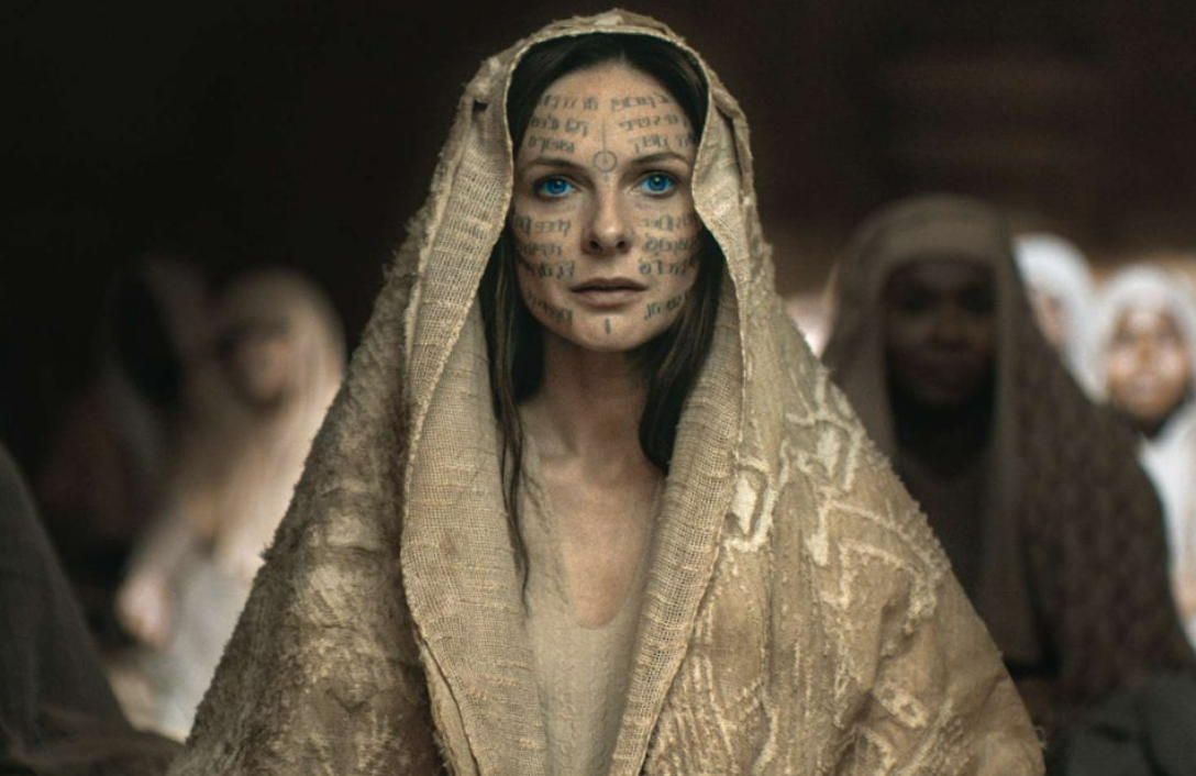 이 영화에서 이 언어가 빛을 발하는 장면은 프레멘의 수장 스틸가(하비에르 바르뎀 분)가 폴에게 부족의 언어를 가르치며 유머를 구사하는 대목의 그 발성인데, 참으로 멋지다. 아랍 계통의 언어가 이렇게도 활력이 있구나 나는 느꼈다. 그런데 이 활기찬 언어를 주인공 폴이 발음하면 뭔가 우울하고 왠지 비장하다. 그래서 메시아는 메시아, 리산 알 가입인 듯싶다. 그리고 이 차콥사어는 영화 제작 과정에서 문자 체계를 완성하였고 폴의 어머니, 제시카 아트레이데스(레베카 퍼거슨 분)가 푸른색 물을 먹고 푸른 눈을 가진 ‘대모’가 될 때 얼굴에 문신이 새겨지는 압도적 장면으로 등장한다. 마치 우리 영화 <파묘>에서 무당 김고은이 얼굴에 한자 축경을 새기는 장면과 견줄 만하다. 공교롭게 개봉 연도가 2024년으로 같다.