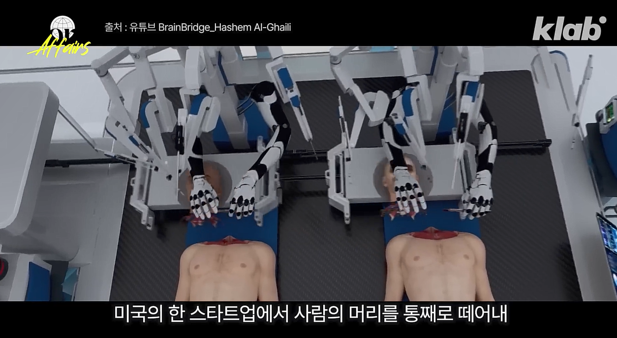 실제 유튜브에서 미국의 한 스타트 기업이 불치병을 앓고 있는 러시아 부자 노인의 의뢰를 받고 AI 로봇의 기술력을 바탕으로 젊은 뇌사자의 몸에 자신의 뇌를 봉합하는 수술을 하기로 예약했다고 보도되었다. 2024년 기사이고 8년 후라고 했으니 2032년이 첫 시도가 될 것이다. 물론, 그때까지 그 의뢰인이 살아 있어야 할 테고 온갖 변수가 생기겠지만, 나는 꼭 기억하고 그때 기사를 챙겨볼 작정이다. 이 시도 자체가 여러 상상을 불러일으킨다. 인간이 그동안 극복하지 못하고 차별의 요소로 남겨두어야만 했던 생물학적 요소, 즉 인종, 성별, 연령(노화), 이 문제들에 대해서 이 ‘뇌 이식을 통한 인간 복제’ 기술은 과연 어떠한 해답을 내놓을지 말이다.