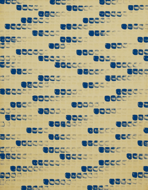 캔버스와 이우환의 사이에서 무슨 일이 있었기에, 아무것도 모르는 나도 그의 추상화로부터 기묘한 우아함을 느꼈던 것일까. 흐린 레몬색 바탕 위에 별처럼 수놓아진 파란색 네모들이 존재하고 있다. 가로로 줄지은 네모들은 백 퍼센트의 블루에서 점점 옅어지면서 서쪽에서 동쪽으로 갈수록 에너지가 빠지는 것 같다. 네모 행렬이 수십 줄 늘어서 있는데 파란 물감이 닿은 면들과 그렇지 않은 면들 사이에 예민한 긴장감이 배어 나온다.