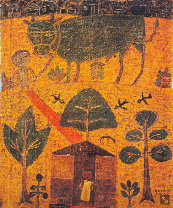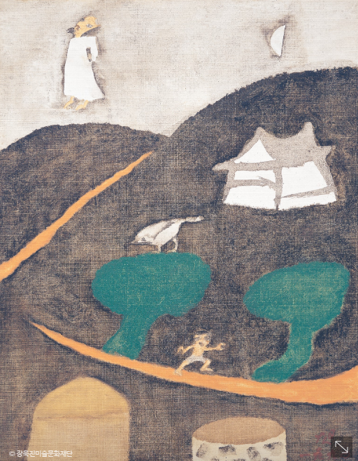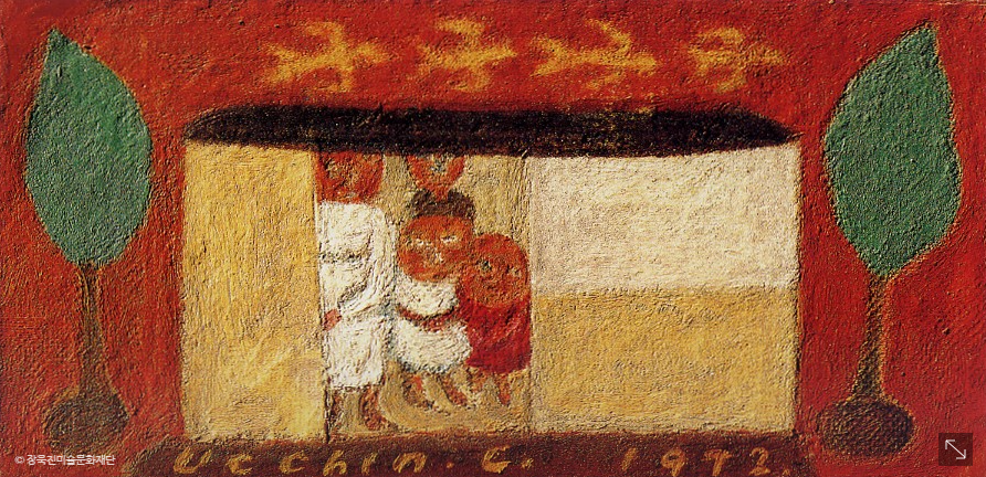 작고 소박하고 따뜻한 장욱진의 집들은 그저 밥을 해 먹고 도란도란 모여서 떠들고 노는 초가집들이 대부분이다. 부동산적인 가치는 응팔동네 못지않게 낮아 보이나 가족들에게 평생 인출하고도 남을 만큼의 액수가 찍힌 정서통장 하나쯤 마련해 주었을 것 같은 집들이다. 화백이 저 집 한구석 바닥에 주저앉아 캔버스를 포옹하듯이 싸안고 붓과 물감 사이를 분주히 오가는 동안 계절이 바뀌고 아이들이 자라고 화가의 몸은 소진되어 갔을 것이다. 시대에 따라 집 앞에 자전거가 놓이기도 하고 자동차가 놓이기도 했다. 그러나 나무와 소가 자동차로 바뀐다고 해도 집이라는 다정한 네모는 겉에 그려진 스케치만으로도 그 속 안의 온기를 가늠케 해 준다.