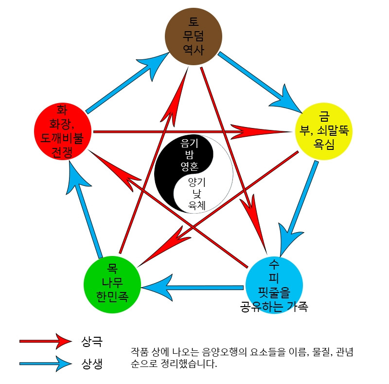 작품 내 음양오행의 요소들을 정리했다.