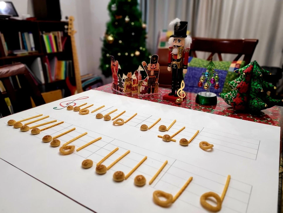 과자악보사분음표는 동그란 칸쵸, 이분음표는 가운데가 뚫린 양파링, 음표의 기둥은 길쭉한 구운 감자 과자예요. 아이에게는 악보를 그려보는 첫 경험입니다. 과자를 얼른 먹고 싶은 마음에 더욱 열심을 냅니다.