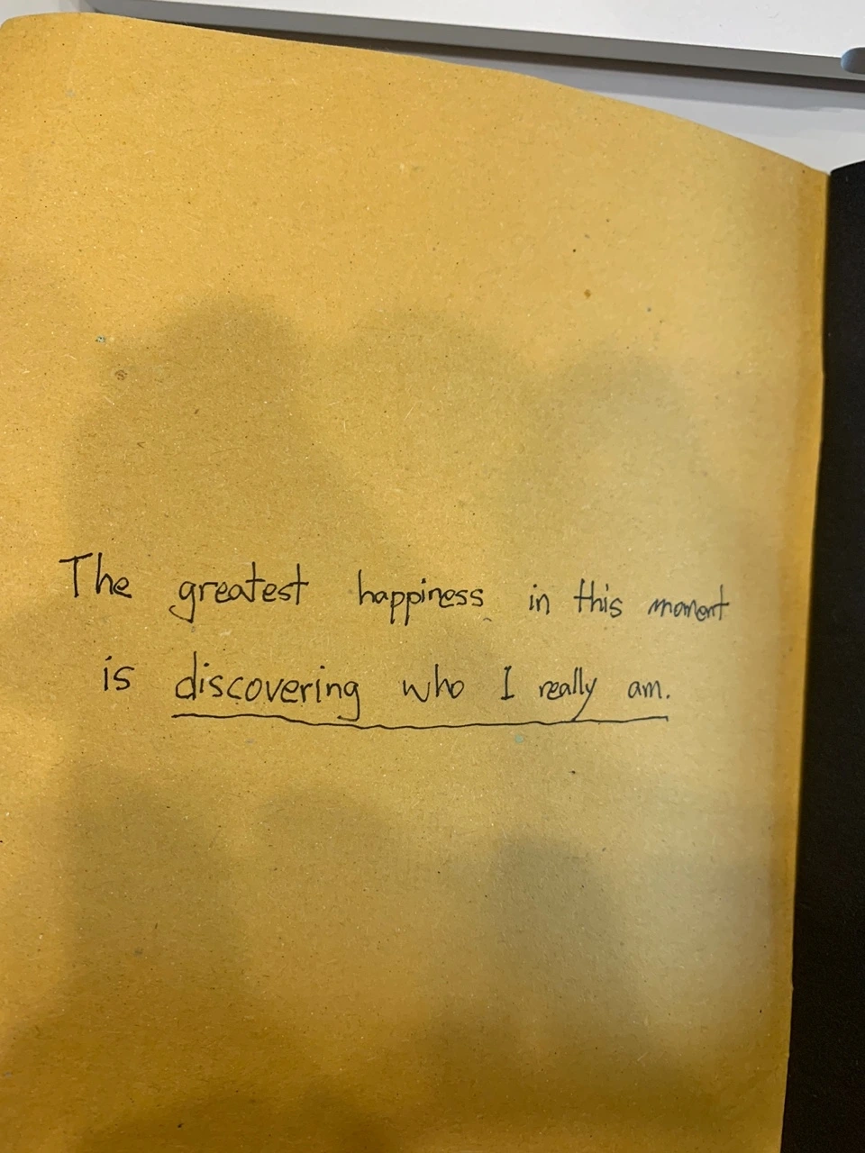 나는 매일 가는 도서관 아래 있는 갤러리에 연간 회원으로 등록이 되어있어서 공짜 티켓을 받을 수 있다. 예전에 A가 그 갤러리를 가고 싶다고 했다. 내 티켓을 받아서 A에게 줬다. A는 전시를 다 보고 고맙다며 얇은 노트를 주면서 이곳에는 행복을 적어보라고 했다. 노트의 표지에는 ‘행복은 종착지가 아니라 여정이다. (Happiness is a journey, not a destination.)’라고 적혀 있었다.