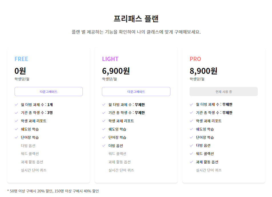그리고 일정 비용이 발생하는 LIGHT와 PRO 등급이 있는데요. 두 등급 모두 등록 가능 학생과 생성 과제 수에 제한이 없기 때문에 상황에 맞는 유연한 커리큘럼 운영이 가능합니다. 다만, (위의 그림과 같이) 등급에 따라 활용 가능한 옵션에 차이가 존재한다는 부분을 확인해 주세요.