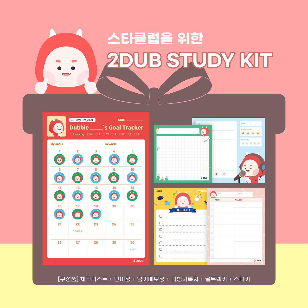 투덥 스터디 키트는 기본적으로 더빙 활동과 연계하여 활용 가능한 품목들로 구성되었는데요. 키트에는 오늘 어떤 영상의 더빙을 얼마나 열심히 했는지 기록할 수 있는 '더빙 기록지'와 '골트랙커', 더빙 활동 중 새롭게 배운 단어를 잊지 않도록 메모할 수 있는 '단어장', '암기 메모장'과 같이 더빙 학습 효과를 극대화할 수 있는 아이템들로 채워져 있습니다.