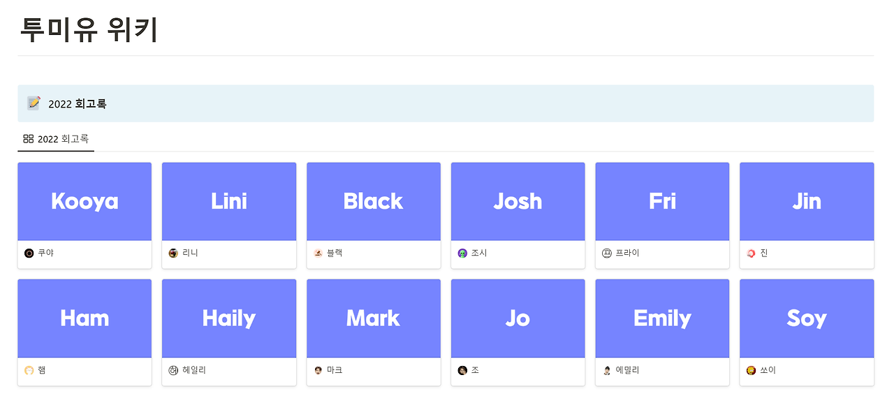 즐겁게 작업했던 회고 보드 결과물까지 '투미유 위키'에 올려둠으로써 투미유 팀의 2022년 마지막 활동은 이렇게 마무리되었습니다. 완성된 작품들을 다시 보니 한 해가 지났다는 사실이 더더욱 실감 나네요.