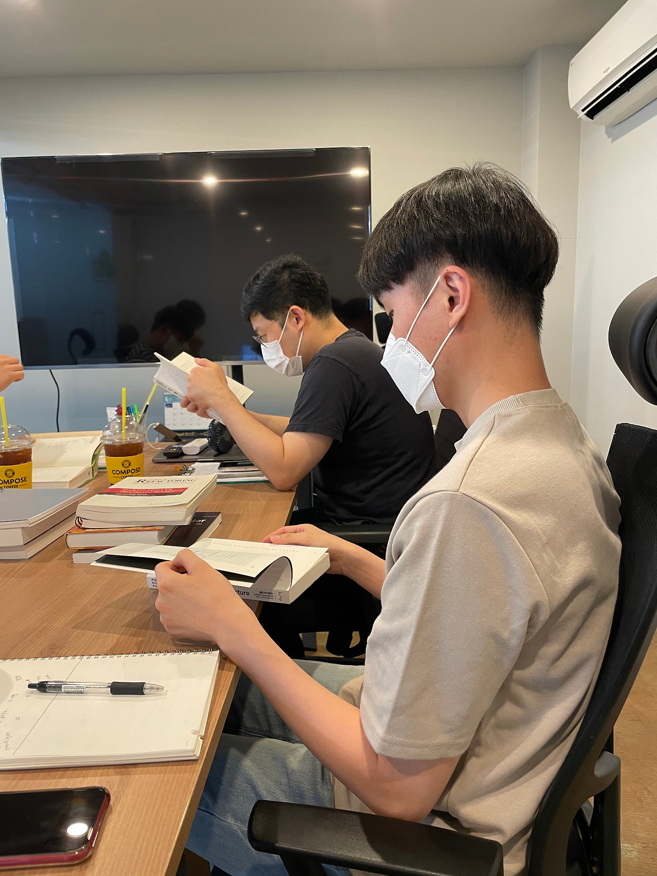 DEV 팀에서는 매주 한 번씩 다 같이 모여 독서 후 리뷰하는 시간을 갖고 있습니다. 기존에 자신이 갖고 있던 책이나 지원을 받아 새롭게 구매한 책들을 모아놓고 빠르게 훑어본 다음, 각자 원하는 책과 읽을 파트를 정해 약 20분간 집중해 읽어보고 자신이 읽은 내용에 대한 소감이나 배운 점을 팀원들과 공유하는 것이죠.