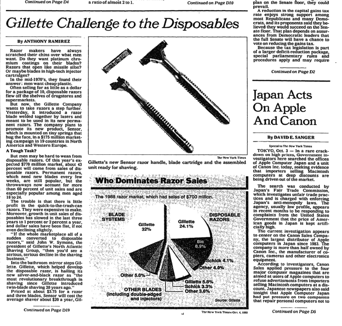 70년대 미국의 경제 대공황, 사람들은 값싼 일회용 면도기만 사기 시작했습니다. 어려운 시기에 사람들은 일회용 면도기를 일회용으로 사용하지 않기 시작해, 그마저도 판매량이 줄었습니다. 수익성이 낮은 일회용 면도기만 팔리게 되면 시장에 심각한 문제를 야기시킨다고 판단한 질레트는 면도날 교체 형태의 카트리지 면도기를 개발했습니다. 이렇게 빠르게 시장을 선점한 질레트이지만 곧 경쟁사들의 유사 상품이 출시되었습니다. 하지만 이또한 예측을 하여 경쟁사들의 유사 상품 출시에 맞춰, 더 좋은 기능을 추가한 제품을 출시합니다. 경쟁사가 질레트보다 더 좋은 기능의 제품을 고민할 때, 질레트는 완전히 새로운 기능, 경쟁자가 없는 제품을 출시합니다. 그리하여 질레트는 늘 새로운 시장의 리더가 되어왔습니다. 하지만, 이런 새로운 기능과 화려한 디자인의 면도기는 1년만 지나면 옛 것이 되고, 기존의 면도기는 불편한 면도기가 되어버립니다.