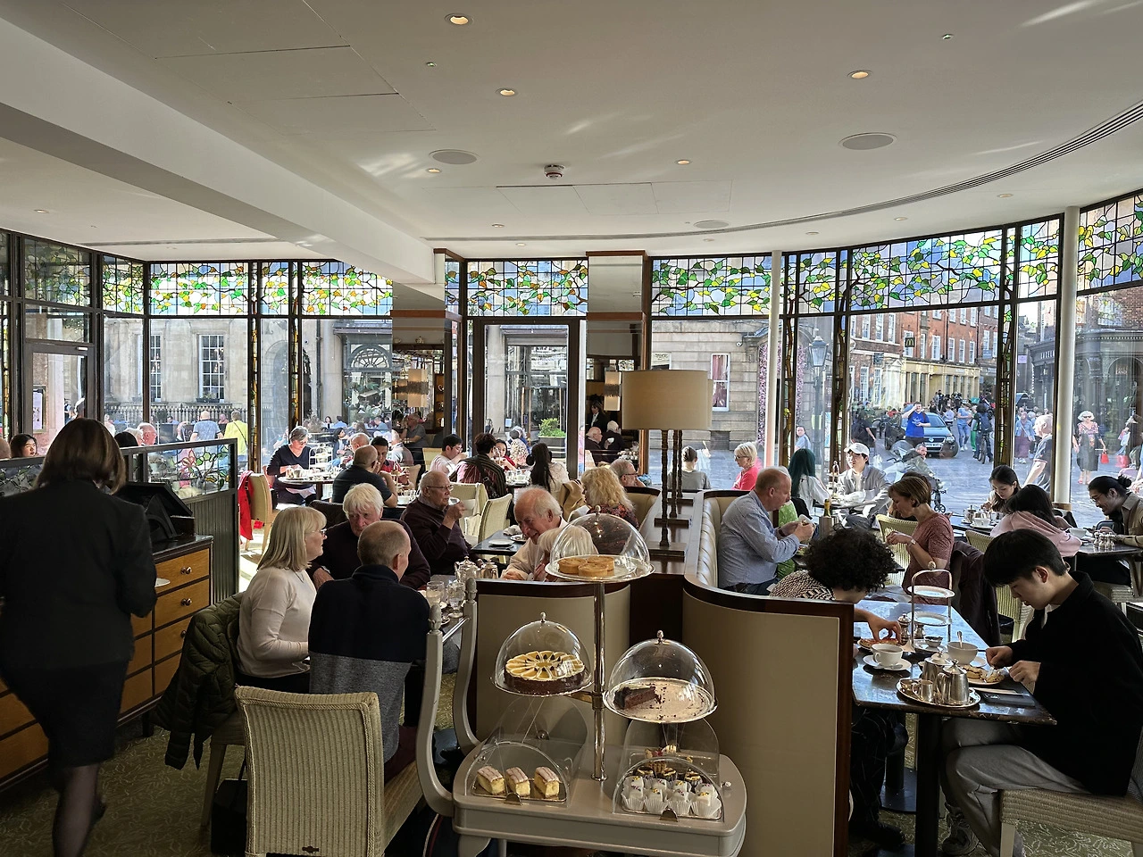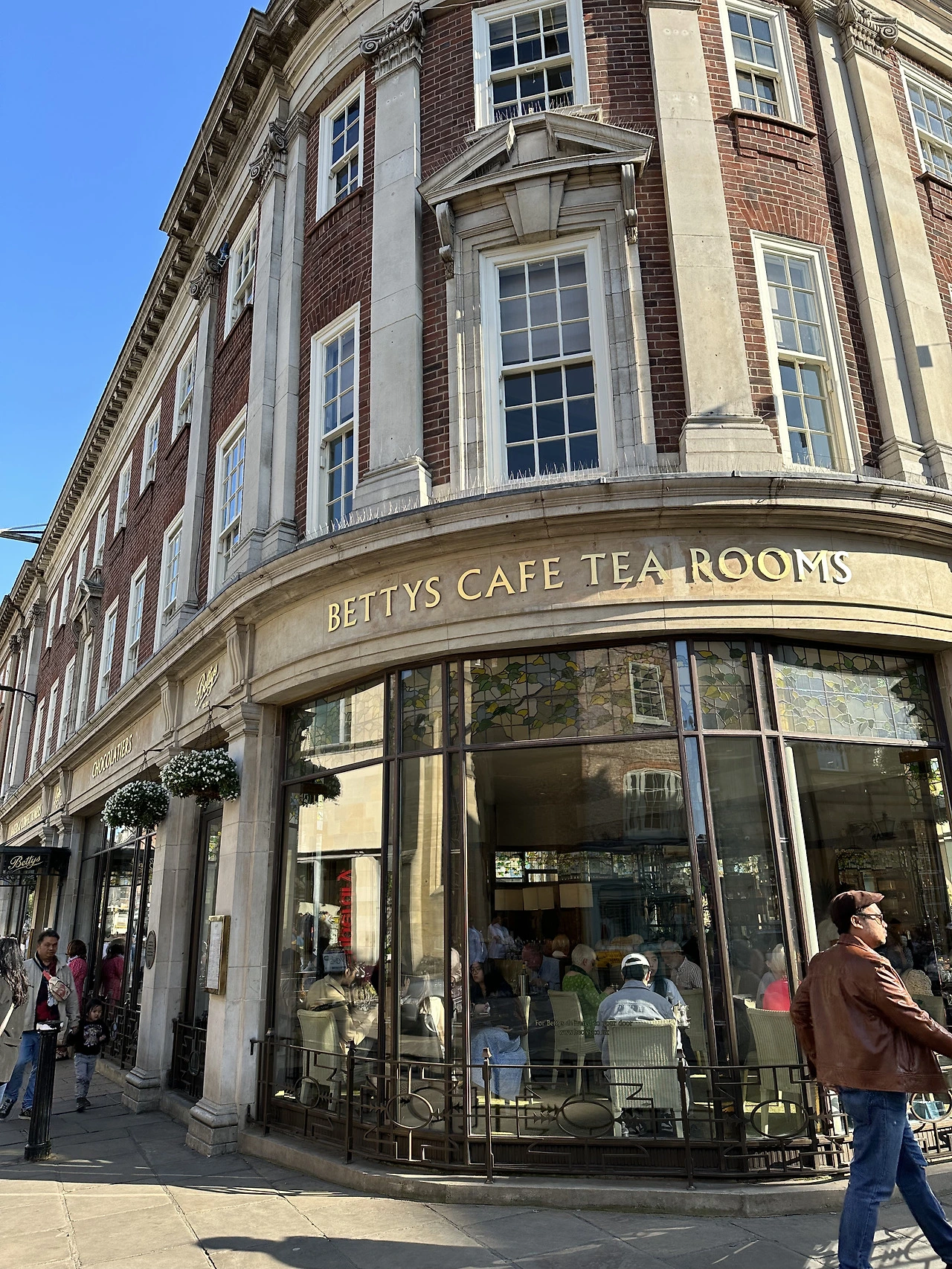 박물관을 구경한 후에는 디저트 타임, 요크에서 가장 유명한 베티스 카페 티룸으로 향했다. 이곳은 1919년에 문을 연 이래로 많은 사랑을 받아온 곳으로, 전통적인 애프터눈 티를 즐길 수 있다. 특히 이곳의 시그니처 메뉴인 파티시 에클레어(Pâtisserie Eclair)와 요크셔 티(Yorkshire Tea)는 꼭 맛봐야 한다. 우리 부부는 디저트를 먹기 위해 이곳에 왔기 때문에 애프터눈 티(£30) 대신 스콘과 티를 함께 맛볼 수 있는 요크셔 티(£13.5)를 주문했는데, 맛도 있었고 우아한 분위기 속에서 티타임을 즐길 수 있었다는 것이 좋았다. 참고로, 우리는 이날 점심식사를 쉠블즈 마켓(야외 푸드코트 형식)에서 이것저것 골라먹었는데 여기서 점심식사를 해도 좋을 듯하다.