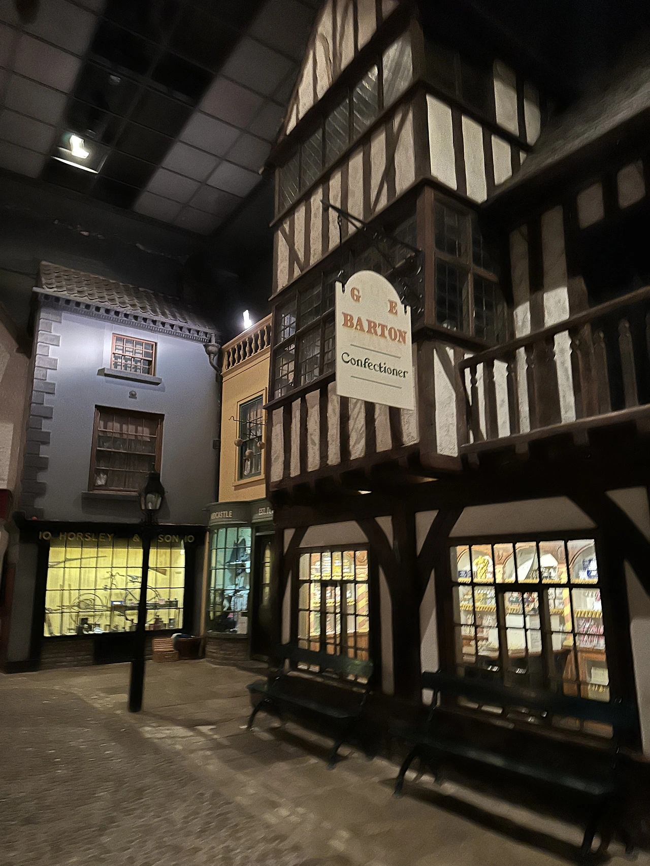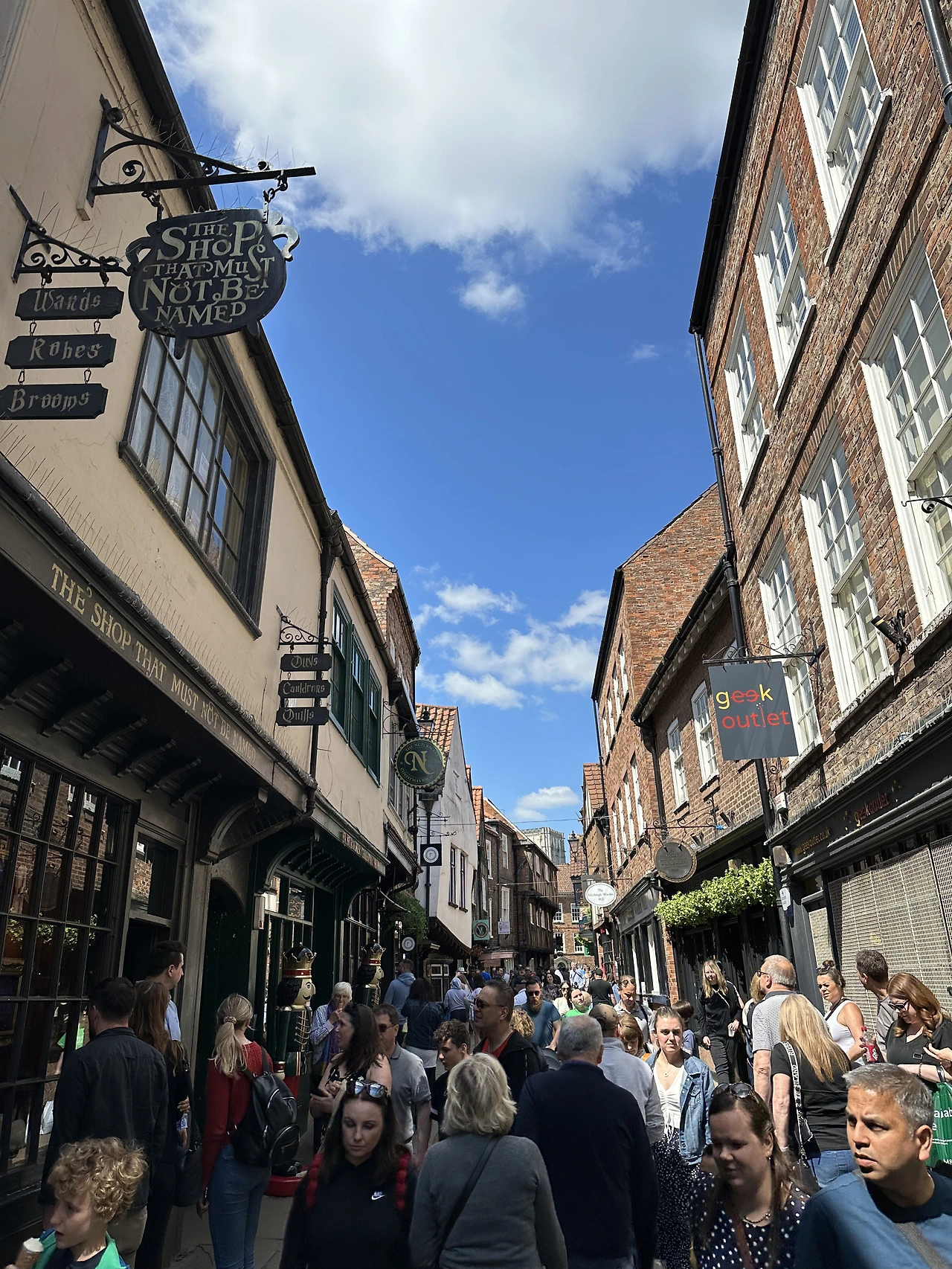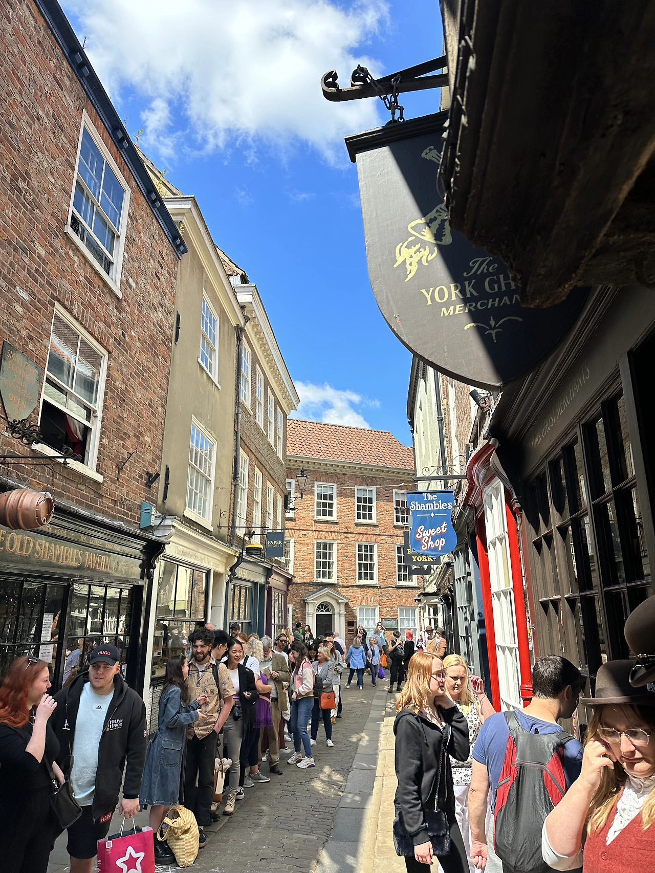 요크 민스터를 뒤로하고 우리는 쉠블즈 거리로 향했다. 쉠블즈는 요크에서 가장 유명한 거리 중 하나로, 중세 시대의 모습을 그대로 간직한 듯한 좁은 골목길이다. Shambles라는 단어는 '도살장'이라는 뜻을 가진 단어에서 시작되었는데, 사실 이 거리는 1800년대 푸줏간 거리였다. 15세기 튜더(Tudor) 양식 건물들이 그대로 남아 있는 이 거리를 걷다 보면, 마치 다른 시공간에 와 있는 듯한 느낌이 든다. 건물들이 거리로 튀어나와 서로 마주 보고 있는데, 이는 차양처럼 햇빛을 가려 고기를 오랫동안 보존하려는 목적에서 만들어졌다고 한다.