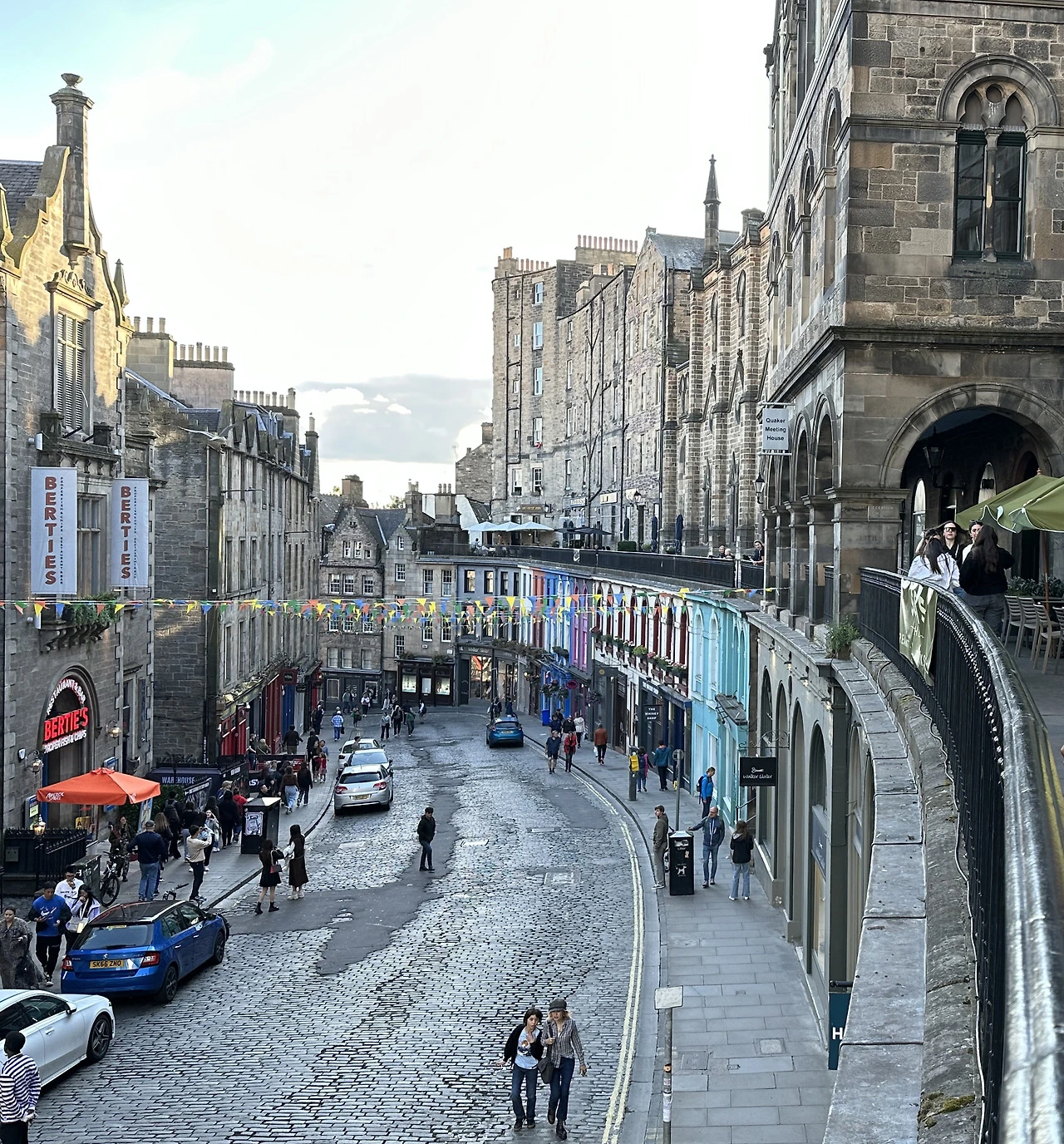 에든버러에서 가장 예쁜 거리를 꼽자면 단연 빅토리아 테라스(Victoria Terrace)다. 이곳은 거리의 색감과 건물의 독특한 분위기로 유명하다. 특히 '해리포터'에 등장하는 거리인 다이애건 앨리의 영감이 된 곳으로도 잘 알려져 있어, 해리포터 팬들에게는 놓칠 수 없는 명소다. 테라스에 서서 에든버러의 구불구불한 거리와 고풍스러운 건물들을 내려다보면, 마치 해리포터 작품 속으로(?) 들어온 듯한 기분이 든다.