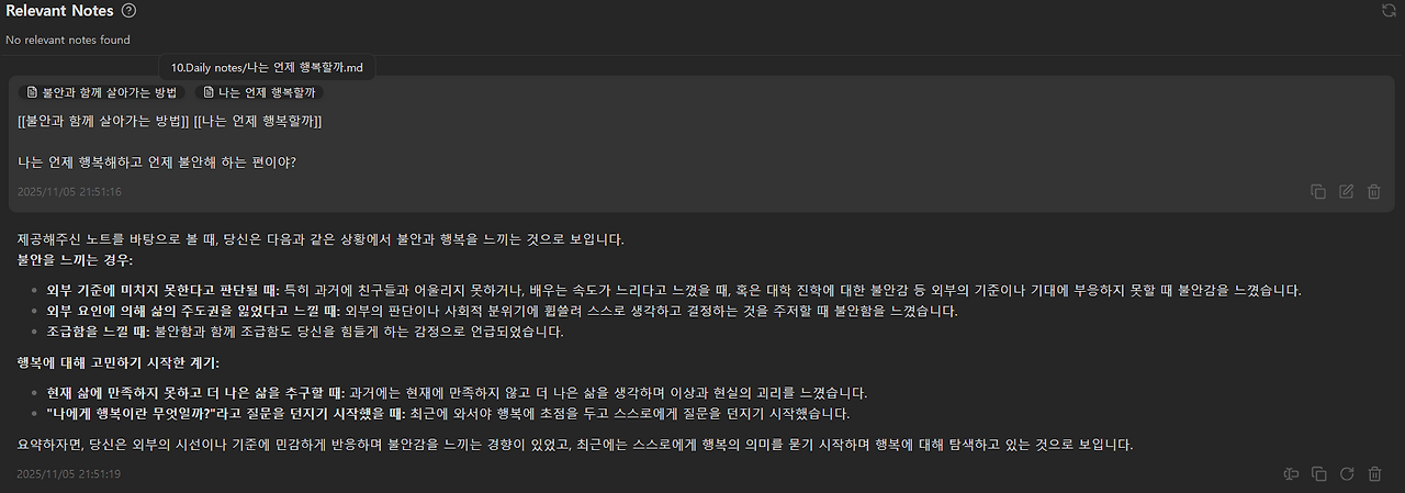 그래서 자연스럽게 이런 질문이 떠오른다. “내가 쌓아온 노트들을 기반으로, ChatGPT에게 묻듯 바로 의견을 얻을 수 있다면?” 노트를 뒤지는 대신, “예전에 비슷한 생각 정리한 적 있어?”, “같은 주제로 정리한 메모 요약해줘.” 이렇게 물어볼 수 있다면 훨씬 자연스러울 것이다.