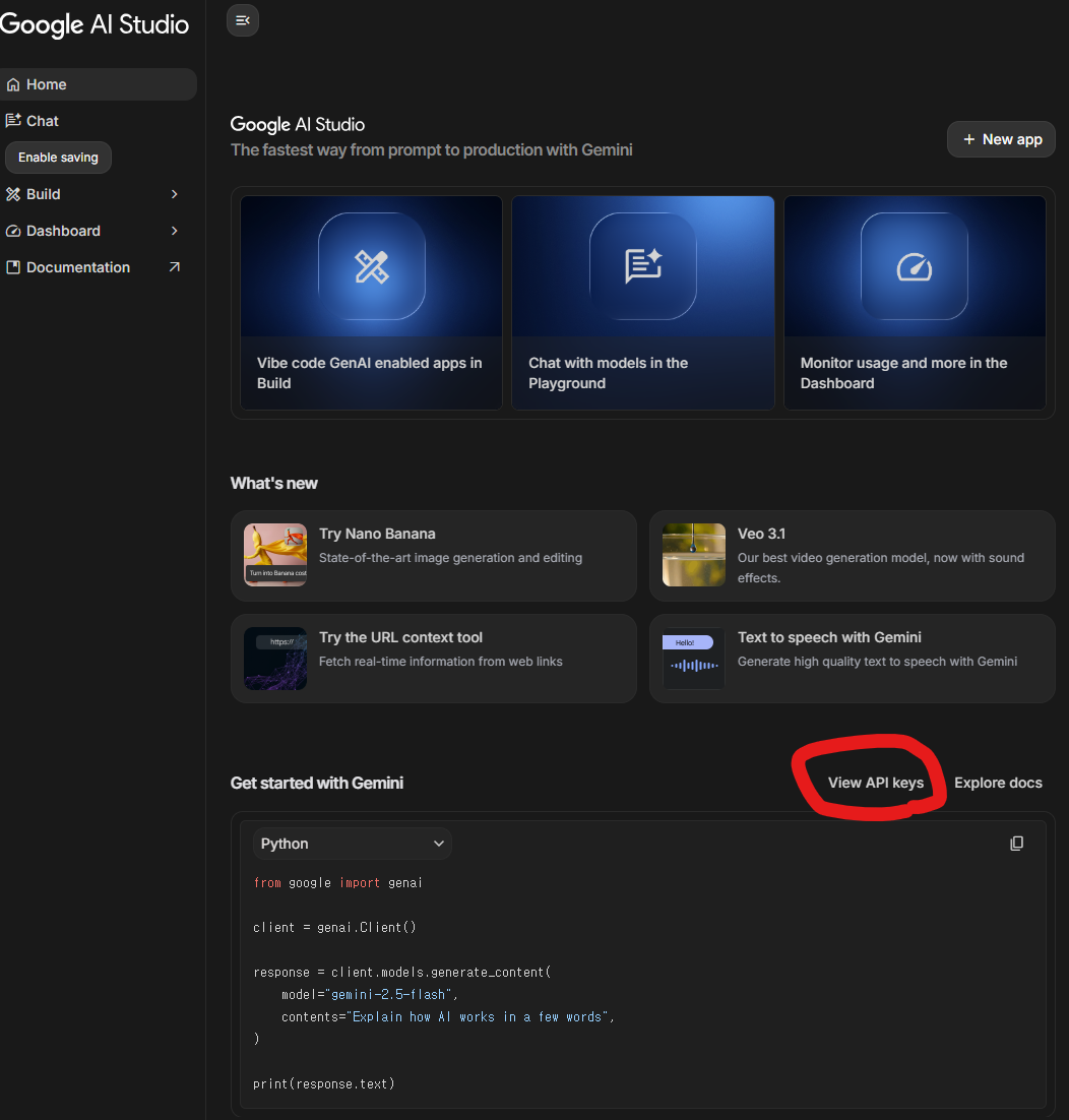 API Keys -> 'Gemini' 입력란에 발급한 키 복사하여 붙여넣기