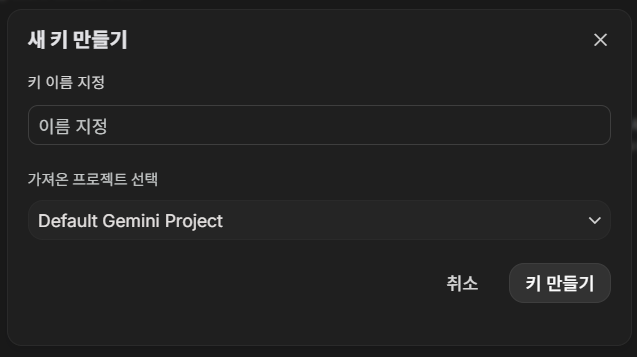 키 이름 지정 -> [Default Gemini Project] 선택 -> 키 만들기
