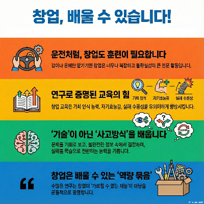 또한 Martin, McNally & Kay(2013)의 메타분석 연구에 따르면, 창업 교육은 단순히 지식을 전달하는 것을 넘어 창업 의도와 기회 포착 능력, 그리고 무엇보다 '해낼 수 있다는 믿음(Self-efficacy)'을 통계적으로 유의미하게 높여주는 것으로 나타났습니다[2]. 국내외의 수많은 연구가 가리키는 방향은 명확합니다. 창업은 ‘가르칠 수 없는 신비로운 재능’이 아니라, 체계적인 설계에 따라 ‘배울 수 있는 역량의 집합’입니다.