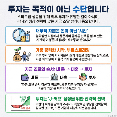 결론적으로 재무적 자본을 마련하는 길은 하나가 아닙니다. 자기자본을 아껴 쓸 수도, 매출로 충당할 수도, 정부 지원금을 활용할 수도, 투자를 받을 수도 있습니다. 중요한 것은 "어떤 방식이 내 창업의 본질과 맞는가"입니다. 투자를 많이 받았다고 성공한 창업가가 아니고, 투자를 안 받았다고 실패한 창업가가 아닙니다. 투자는 성공의 증명서가 아니라, 내가 선택한 성장 방식에 따른 수단일 뿐이니까요. 창업가 여러분, 돈을 쫓기보다 '돈이 왜 필요한지'를 먼저 결정하십시오. 재무적 자본은 그 결정 뒤에 자연스럽게 따라올 때 가장 강력한 힘을 발휘합니다.