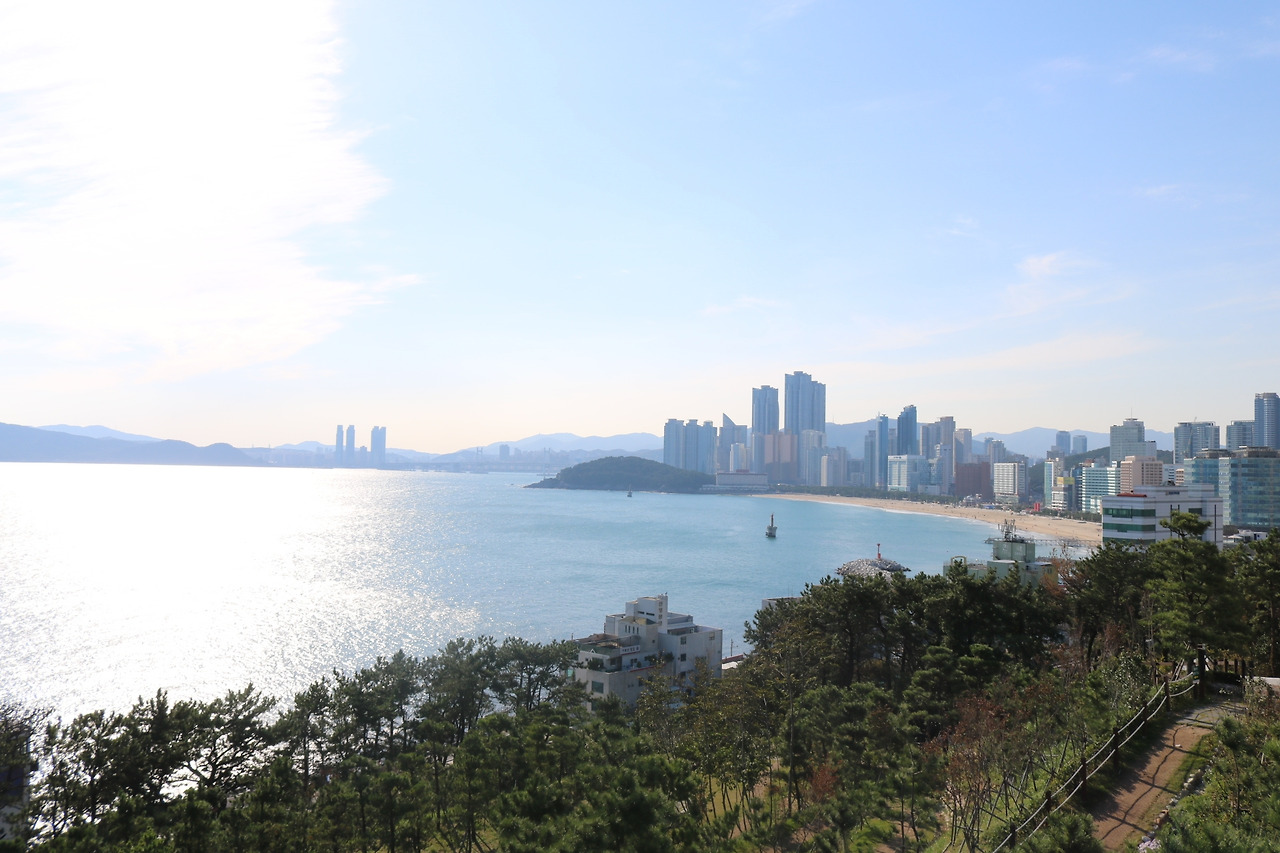 달맞이길의 도로 오른쪽 산책로에서는 해운대 해수욕장이 보인다. 날씨가 맑은 날에는 엔트리 레벨의 DSLR로는 도저히 담을 수 없는 멋진 광경이 펼쳐진다.