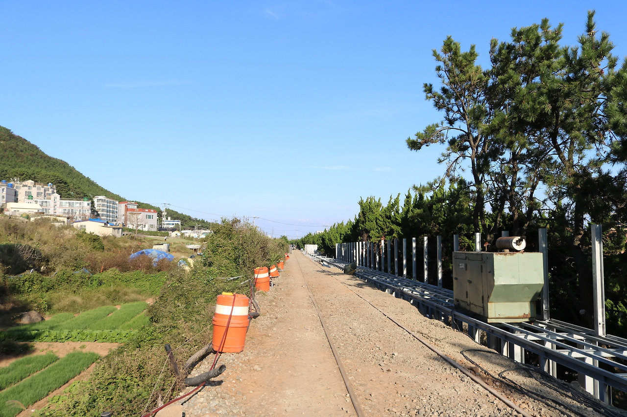 문탠로드 중간에 청사포로 갈 수 있는 길이 있었다. 청사포 구경도 좋겠다 싶어 잠깐 길을 셌다. 문탠로드를 벗어서 청사포를 가는 길에는 오래된 철로, 지금은 쓰지 않는 듯한 철로가 놓여 있었다. 이는 동해남부선의 폐선이다. 폐선 옆에 새로운 구조물이 건설되고 있었는데 아마도 관광목적으로 사용될 것 같다. 사진에서 이 길을 따라 위쪽으로 쭉 걸어가면 청사포로 갈 수 있다.