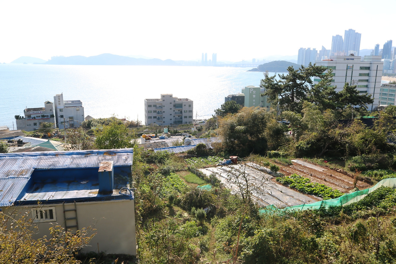 달맞이길이 개발되었음에도 불구하고 달맞이길 난간 너머로 또 다른 '사람 사는 곳'이 있음을 알 수 있다. 푸르게 펼쳐진 바다 앞에서 밭을 일구고 살아가는 사람들이다. 바로 앞의 바다는 황금 어장일 텐데, 해운대 해수욕장 앞으로 내려가면 적지 않은 장사거리가 있을 텐데, 달맞이길 위의 개발에 기댄 상점을 낼 수도 있었을 텐데, 밭을 일구기로 한 우직한 결정이 경이롭다.
