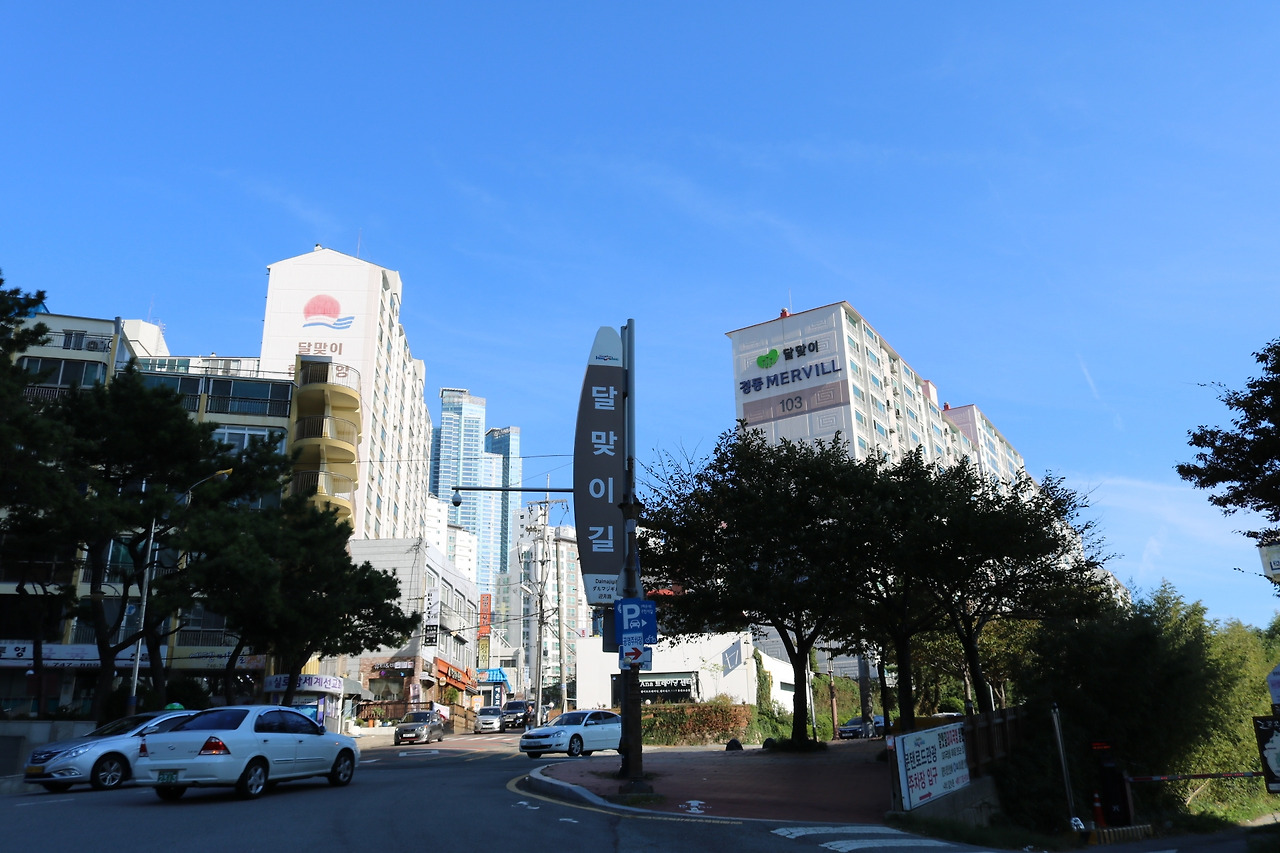 달맞이길임을 알려주는 표지판을 지나면 완만한 경사의 산책로를 따라 걸을 수 있다. 걸어 올라가면 도로 오른쪽으로 나무로 된 인도와 난간이 있고, 왼쪽으로는 호텔, 식당, 갤러리 등이 자리 잡고 있다. 달맞이길을 따라 위치한 상점은 경리단길이나 망리단길 등에서 만날 수 있는 그런 소규모 상점은 아니다. 제법 규모가 크며 적지 않게 프랜차이즈도 보인다. 이 점은 매우 아쉽지만 이 길을 걷는 목적이 꼭 소비에 있는 것은 아니므로 예쁘게 지어진 건물을 자연과 함께 감상하며 걷는 것도 나쁘지는 않다.