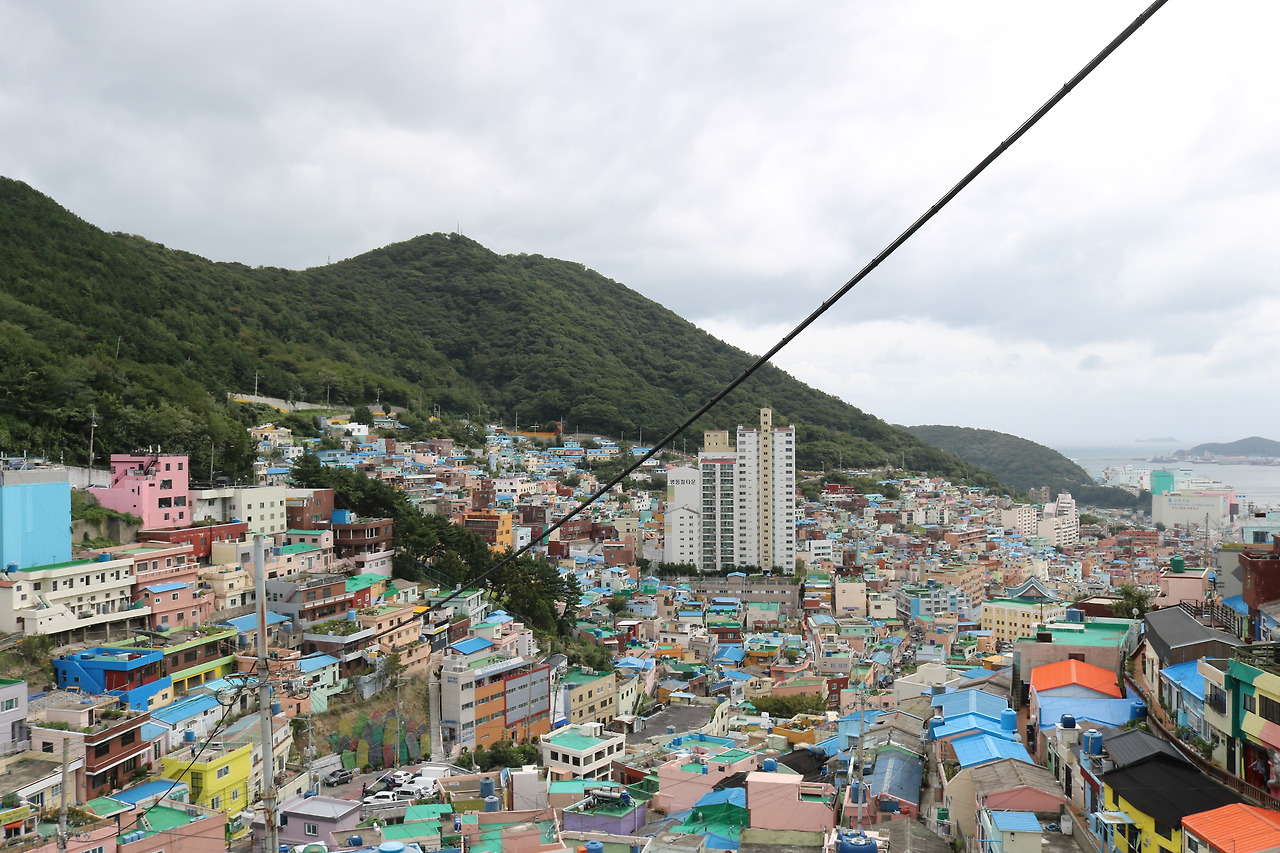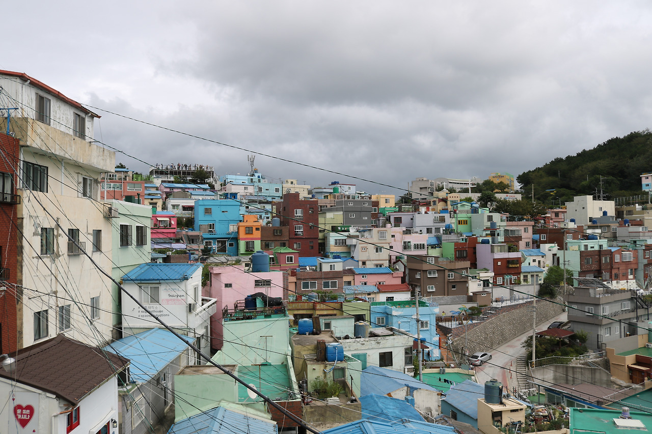 감천마을을 둘러보기 위해 부산으로 떠난 날, 부산은 하늘이 매우 흐렸고 빗방울이 흩뿌렸다. 파란 바다와 만나는 파란 하늘, 그리고 파랗고 붉은빛으로 물들인 주거지를 사진에 담고자 했는데, 안성 사람의 부산 나들이는 시작부터 난관이었다. 그럼에도 불구하고 바라보는 곳곳, 감탄을 자아내기에 충분했다. 사실 사하구에 진입하기 전부터 부산에는 이런 그림의 마을이 적지 않게 조성되어 있는 것을 보았다.