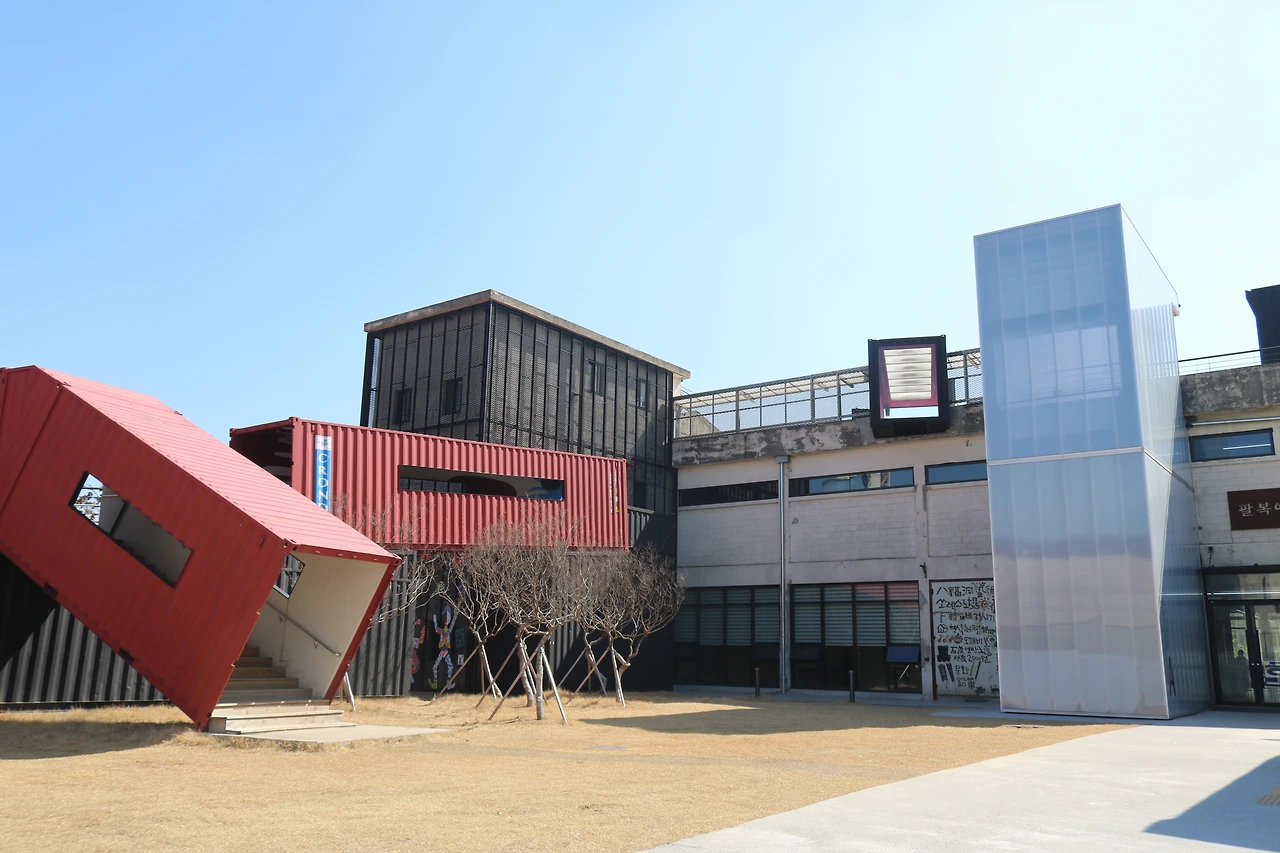 A동에서 아직 개관이 되지 않은 B동을 잇는 것은 컨테이너들이었다. 빨강과 검정이 대비를 이루어 상당히 흥미로웠다. 다음의 사진에서 우측이서 중앙까지 이어진 검정 컨테이너(컨테이너 2)에는 '팔복 스케치북'이 위치하고 있다. 팔복 스케치북은 벽과 바닥에 글라스펜, 백물펜, 수성펜 등을 이용하여 그림을 그리는 공간이다. 그 뒤쪽(사진에서 좌측)으로 보이는 또 다른 검정 컨테이너(컨테이너 1)에는 '만화책방'이 위치하고 있다. 추억의 만화를 보며 잠시 옛 추억에 빠져들 수 있다.