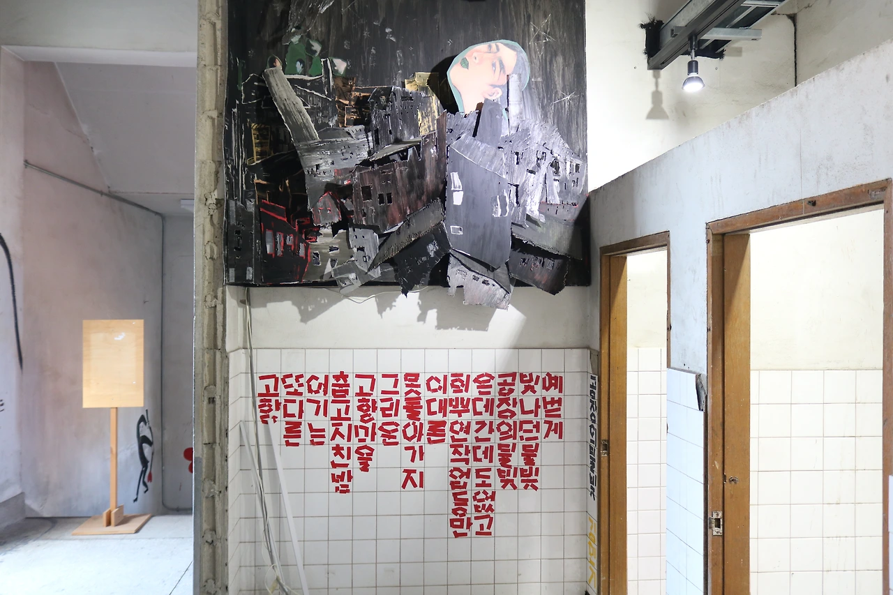 짙은 고독과 쓸쓸함이 느껴졌다. 이 벽면을 장식하여 작품으로 재탄생 시킨 예술가는 팔복예술공장의 공간을 마음으로 이해하고 있는 사람일 것 같다. 고향을 떠나 일자리를 찾아 이 곳으로 몰려온 사람들. 그들은 공장이 문을 닫았을 때, 고향에 두고온 가족 생각에 차마 돌아갈 수 없었겠지. 여기서 어떻게든 새로운 일자리를 얻어보고자 했을 것이다.