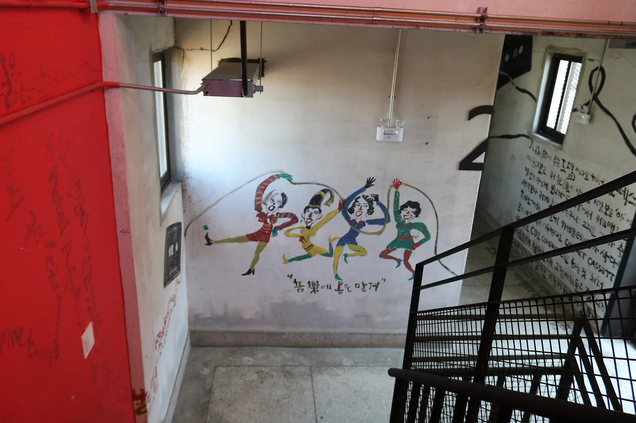 옥상에는 엘리베이터를 타고 올라오는 길이 아닌 다른 길로 1층으로 내려갈 수 있었다. 계단이 1층까지 이어져있는데 내려가는 벽면마다 낙서인지 예술인지 헷갈려서 오히려 더욱 예술로 보이는 그림과 글귀들이 그려져 있었다.