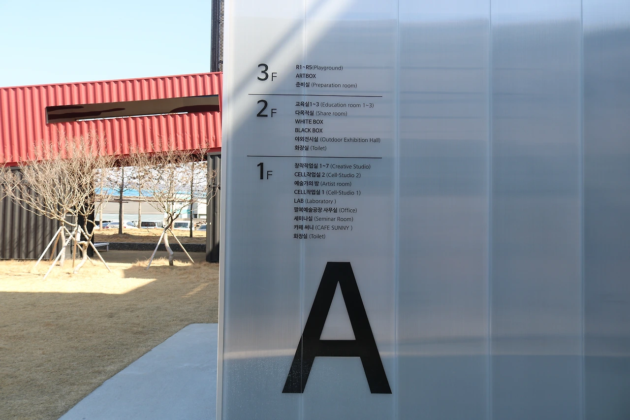 30분 정도 쉼의 시간을 가진 후, 먼저 건물의 외관을 둘러보았다. 다시 문을 열고 나가자 출입문 위에 '팔복예술공장' 표시가 있음을 알게 되었다. 출입문을 나서자마자 '팔복예술공장'의 공간 계획을 한눈에 볼 수 있도록 한쪽 벽면에 층별 안내가 써져 있었다. 1층은 주로 작업실임을 알 수 있었고, 2층은 전시실과 교육실이 주를 이루고 있었다. 3층으로 표시된 곳은 사실 옥상이다.