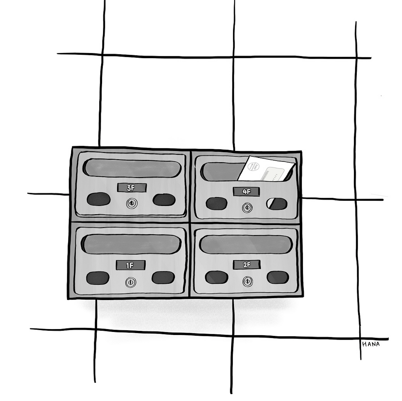 태은이는 편지함이 있는 1층으로 내려갔다. 4층짜리 빌라에는 층마다 두 집이 있었고, 편지함은 층별로 공동으로 사용했다. 태은이가 사는 4층 편지함에는 옆집에게 온 세금 고지서 같은 것이 꽂혀 있었다. 태은이는 손을 편지함 안으로 밀어 넣었다. 몇 개의 편지가 손에 잡혔다. 일단 모두 꺼내 확인해보니, 친구에게 온 편지가 있었다. 너무 반가웠다. 그런데 분명 402호, 자기 집으로 온 편지가 하나 더 있었는데, ‘받는 이: 이지희’로 되어 있었다. 보낸 사람은 박희만이었고, 군인으로 보였다.