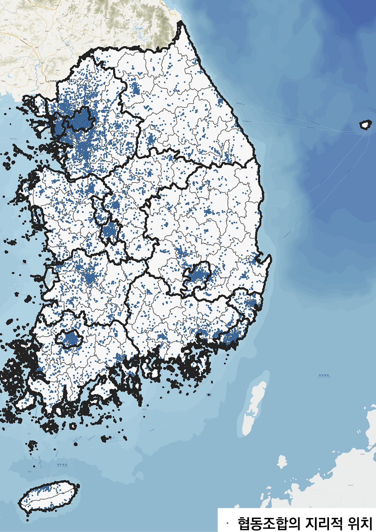 다음으로는 역시 사회적경제를 구성하는 매우 중요한 축인 협동조합을 전국 지도에 뿌려보았다. 등록 협동조합과 인가받은 사회적협동조합을 구분하지 않고 뿌린 것인데 주소는 coop.go.kr에서 얻을 수 있었다.