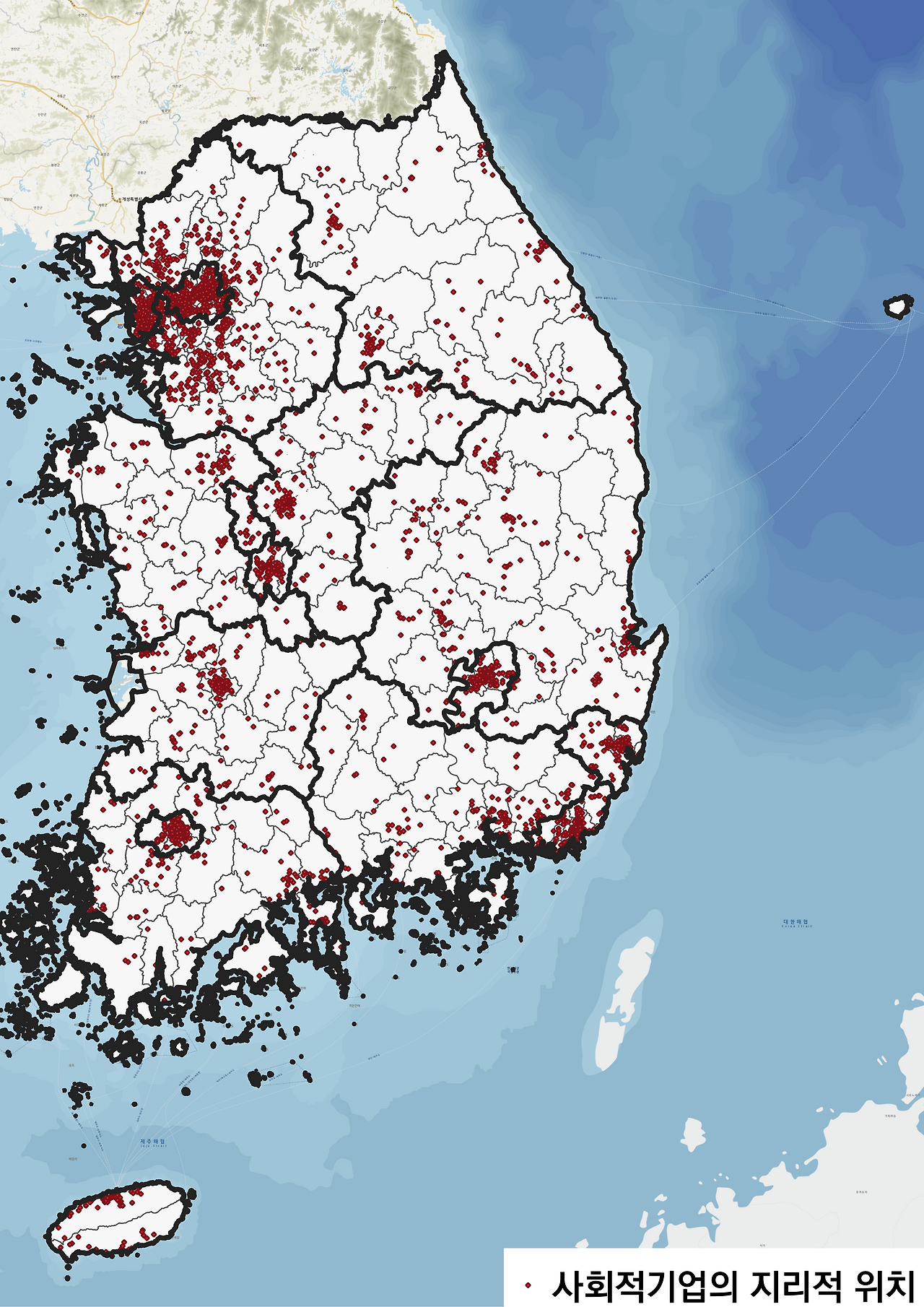 먼저 사회적경제기업의 유형 중 한 축인 사회적기업부터 전국 지도에 뿌려보았다. 인증 사회적기업 목록은 2022년 12월 말일을 기준으로 한국사회적기업진흥원으로부터 받을 수 있었다. 사회적기업의 주소를 xy 좌표로 변환하고, 이를 QGIS라는 지리정보시스템을 통해서 레이어를 형성하여 지도에 불러왔다. 모두 3,535개의 사회적기업이 코딩되었다.