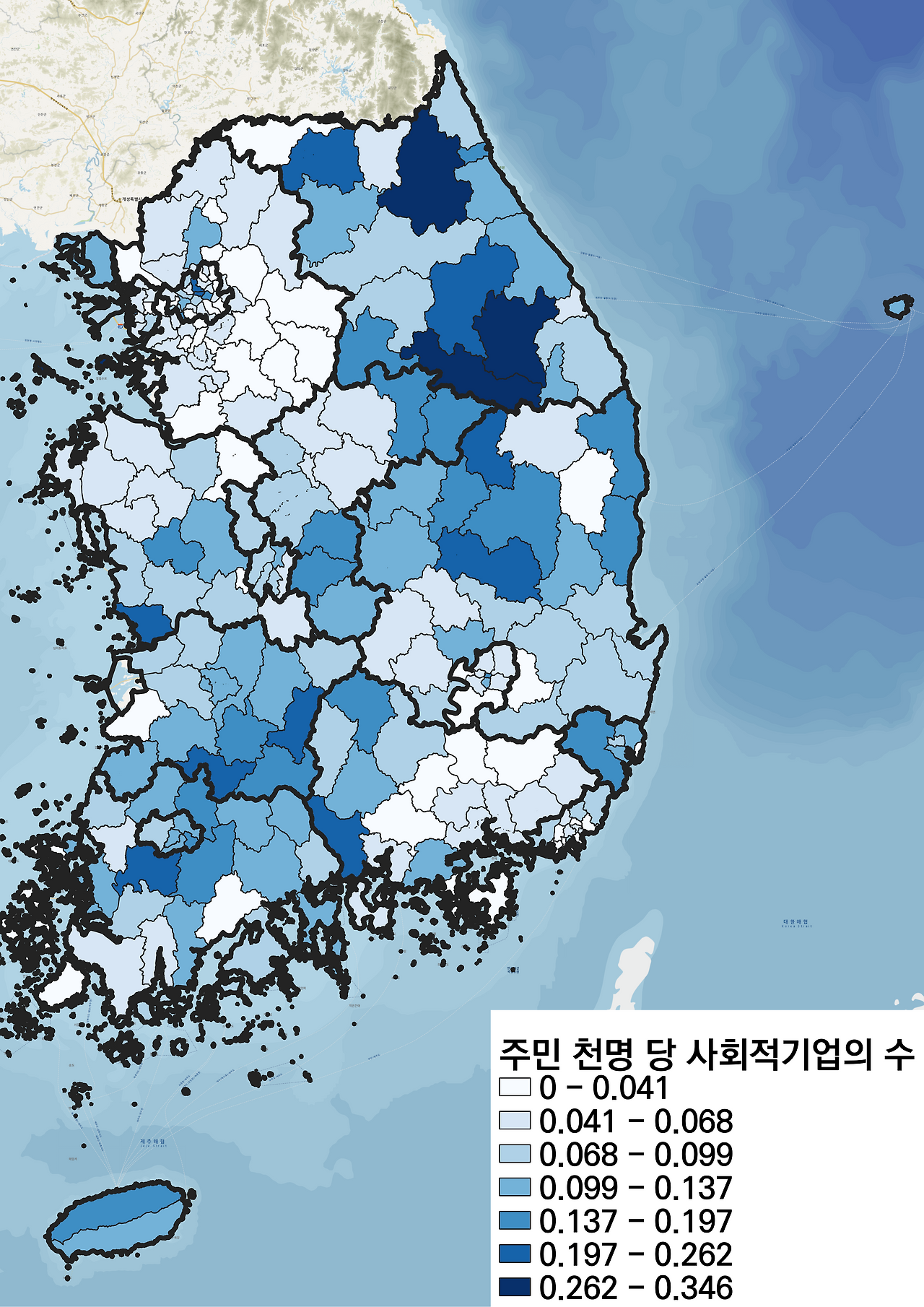 사회적기업의 수를 시군구 별로 모은 다음 그 수를 해당 지역의 주민등록인구로 나누어 그 값을 지도에 표시해 보았다.