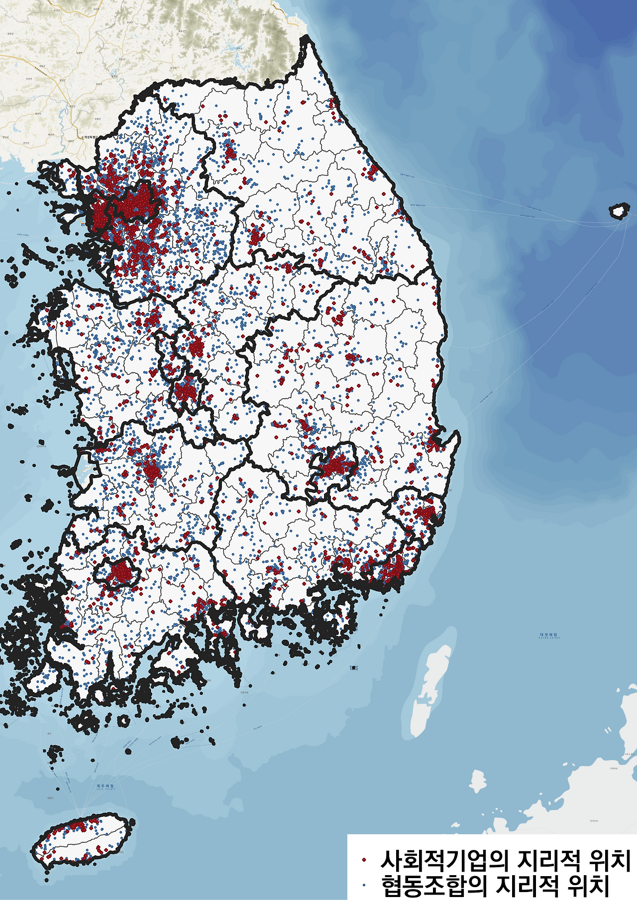 다음 지도에서 확인할 수 있는 것처럼, 붉은 점으로 표시한 사회적기업이 많이 분포한 지역에는 협동조합도 많이 분포한다. 반면, 사회적기업이 거의 존재하지 않은 위치라 할지라도, 비록 많은 수는 아니지만 협동조합은 넓게 퍼져 설립되어 있는 것을 알 수 있다.