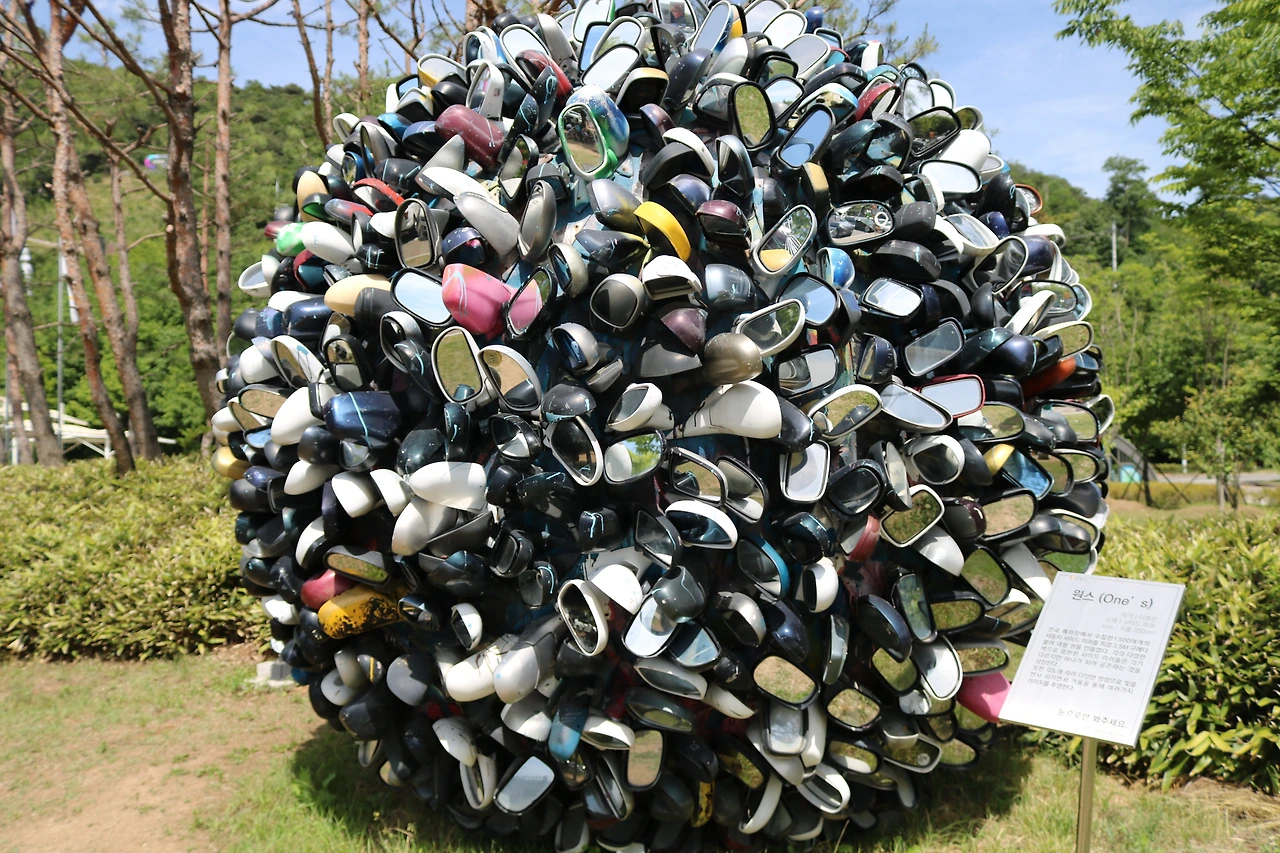 광명동굴이 멋진 것은 내부뿐만 아니다. 동굴 관람을 마치고 나오니 광명업사이클아트센터가 내 방문을 기다리고 있었다. 센터의 외부에도 업사이클을 활용한 작품이 전시되고 있었는데 폐차의 사이드미러를 활용한 작품 'One's가 눈에 확 들어왔다. 작가의 설명에 따르면 1300개의 사이드 미러를 활용해 3.5미터의 구를 만들었다고 한다. 각기 다른 배경에서 자동차의 안전을 지키던 사이드 미러가 한 공간에서 호흡하게 의도한 것이다.
