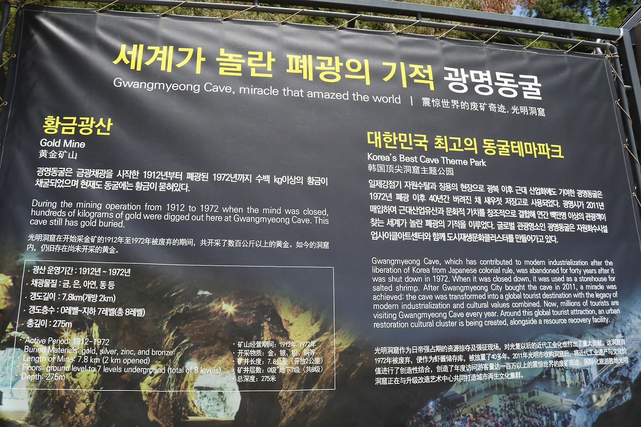 광명동굴은 광명시 가학동 가학산에 위치한 동굴인데 자연 동굴이 아니라 금을 캐내던 금광이었다. 광명동굴에 관한 최초의 기록은 1903년으로 거슬러 올라간다고 하는데 이 금광(예전에는 시흥광산으로 불렸다.)은 1912년 일제가 광업권을 독점하여 본격적으로 개발과 수탈에 나서면서 한국사에 등장했다. 광명동굴은 금광과 은광 개발에 혈안이던 일제에 의한 수탈과 강제 징용, 노역의 현장으로 아픔을 간직한 공간이다.