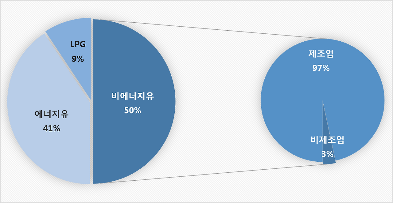 대한민국은 타의적이지만 세계적인 에너지수입국이다. 그 중 석유수입(2016년 924,173 천bbl) 부분에선 세계 5위를 기록하고 있다(WorldFactbook, CIA, 2016). 공급되는 석유의 소비는 크게 에너지유와 비에너지유로 나뉘어 설명 될 수 있다. 명칭 그대로 에너지유는 수송, 발전, 난방 등의 에너지원으로 쓰이는 것이고, 비에너지유는 화학적 작용을 통하여 다른 형태로 변형되어 섬유, 플라스틱 등의 제조원료로 쓰이는 것이다. 2016년 에너지경제연구원의 통계자료를 보면, 절반 이상이 제조업 (석유ㆍ화학 분야가 지배적인)에 사용된 비에너지유로 쓰였다.