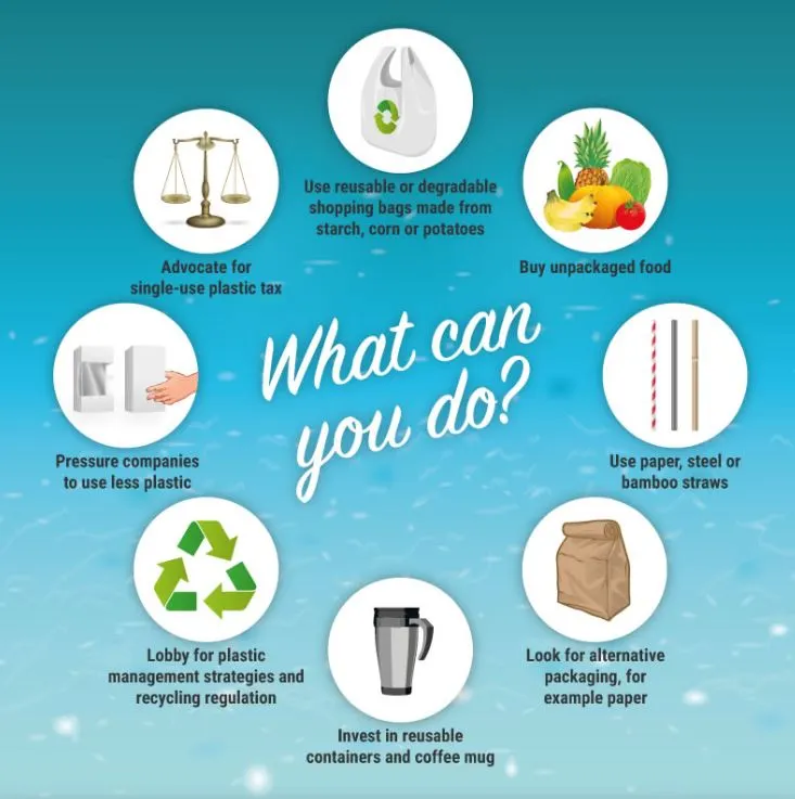 재활용 가능하거나 옥수수나 감자 전분으로 만든 분해성 쇼핑백 사용하기, 플라스틱 팩킹에 되어있지 않은 음식 사기, 종이/대나무/철제 빨대 사용하기, 종이백 같은 플라스틱 포장 대체제 찾아보기, 텀블러나 머그잔 사용하기. 간단하게 시작할 수 있는 선택들이다. 이러한 선택들은 기업이나 사회에서도 독려하고 있다. 공통점은 그리 어려운 선택은 아니나 조금의 편의와 자리잡은 습관에 의해 방해 받는 다는 것이다. 그 방해에 대항하지 않는 것을 필자는 이기심이라 부르고 싶다. (나머지 세가지 : 플라스틱 관련 정책과 재활용 규제에 대한 압력, 기업의 플라스틱 사용 저감 압박, 일회용 플라스틱에 대한 세금부과 옹호)