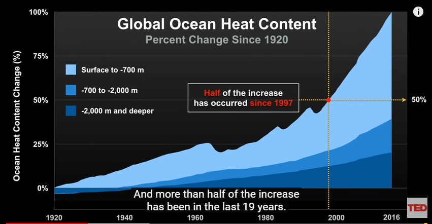 지구 전체적으로 봤을 때 잉여 열에너지의 약 93%는 바다에 갇히게 된다. 그 면적과 해양을 이루는 물 분자들의 열전도성 등을 생각하면 그 이유를 알 수 있다. IPCC 보고서에서는 이를 이렇게 표현한다. (IPCC 보고서 한국어 판을 찾았다... 이제 해석 안 해도 된다. 좌표는 마지막 참고문헌에 ^^)