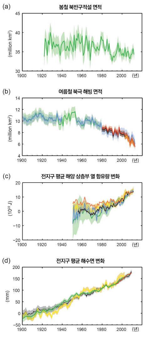 지난 20년간 그린란드와 남극 빙상의 질량이 감소하였고, 전 지구적으로 빙하는 지속적으로 감소되었으며, 북극해 해빙과 북반구의 봄철 적설 면적도 지속적으로 감소하고 있다(높은 신뢰도)